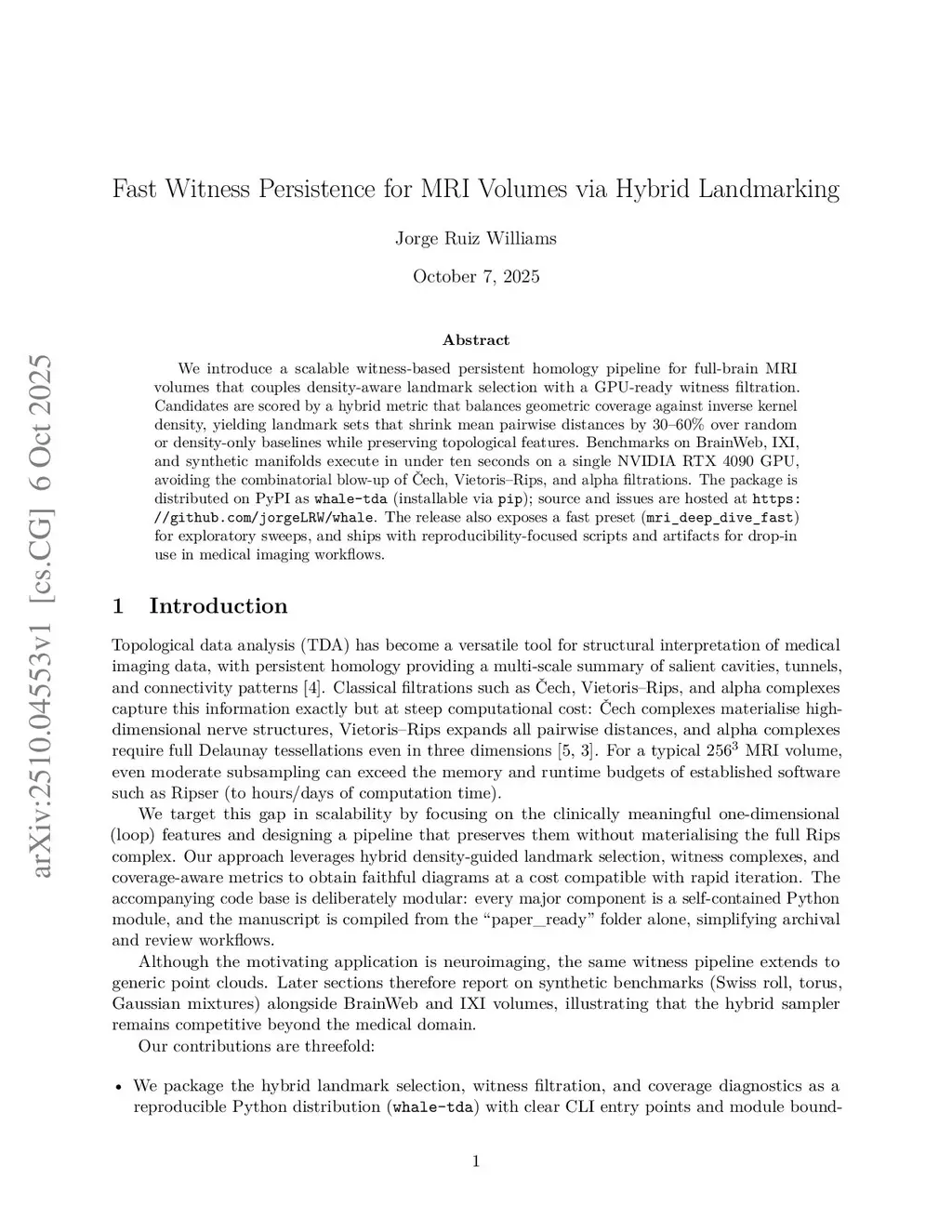 We introduce a scalable witness-based persistent homology pipeline for full-brain MRI volumes that couples density-aware landmark selection with a GPU-ready witness filtration. Candidates are scored by a hybrid metric that balances geometric coverage against inverse kernel density, yielding landmark sets that shrink mean pairwise distances by 30-60% over random or density-only baselines while preserving topological features. Benchmarks on BrainWeb, IXI, and synthetic manifolds execute in under ten seconds on a single NVIDIA RTX 4090 GPU, avoiding the combinatorial blow-up of Cech, Vietoris-Rips, and alpha filtrations. The package is distributed on PyPI as whale-tda (installable via pip); source and issues are hosted atthis https URL. The release also exposes a fast preset (mri_deep_dive_fast) for exploratory sweeps, and ships with reproducibility-focused scripts and artifacts for drop-in use in medical imaging workflows.