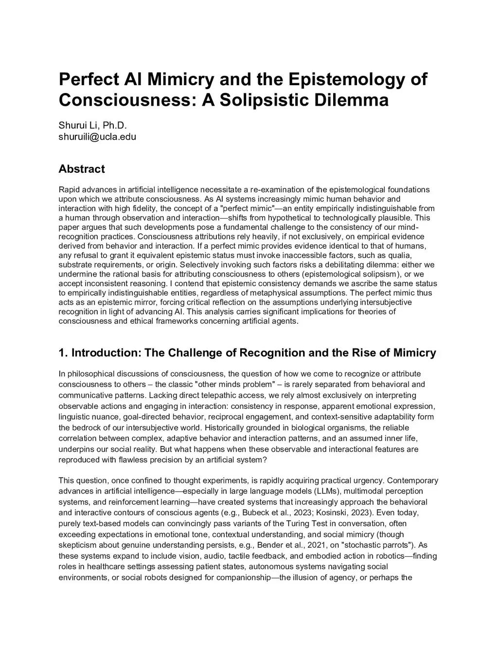 Perfect AI Mimicry and the Epistemology of Consciousness: A Solipsistic Dilemma