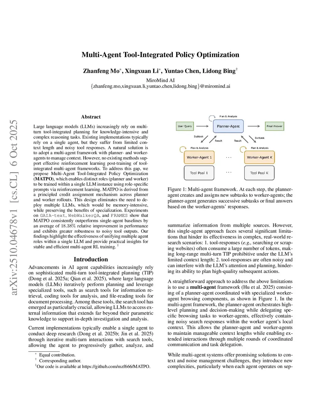 Large language models (LLMs) increasingly rely on multi-turn tool-integrated planning for knowledge-intensive and complex reasoning tasks. Existing implementations typically rely on a single agent, but they suffer from limited context length and noisy tool responses. A natural solution is to adopt a multi-agent framework with planner- and worker-agents to manage context. However, no existing methods support effective reinforcement learning post-training of tool-integrated multi-agent frameworks. To address this gap, we propose Multi-Agent Tool-Integrated Policy Optimization (MATPO), which enables distinct roles (planner and worker) to be trained within a single LLM instance using role-specific prompts via reinforcement learning. MATPO is derived from a principled credit assignment mechanism across planner and worker rollouts. This design eliminates the need to deploy multiple LLMs, which would be memory-intensive, while preserving the benefits of specialization. Experiments on GAIA-text, WebWalkerQA, and FRAMES show that MATPO consistently outperforms single-agent baselines by an average of 18.38% relative improvement in performance and exhibits greater robustness to noisy tool outputs. Our findings highlight the effectiveness of unifying multiple agent roles within a single LLM and provide practical insights for stable and efficient multi-agent RL training.