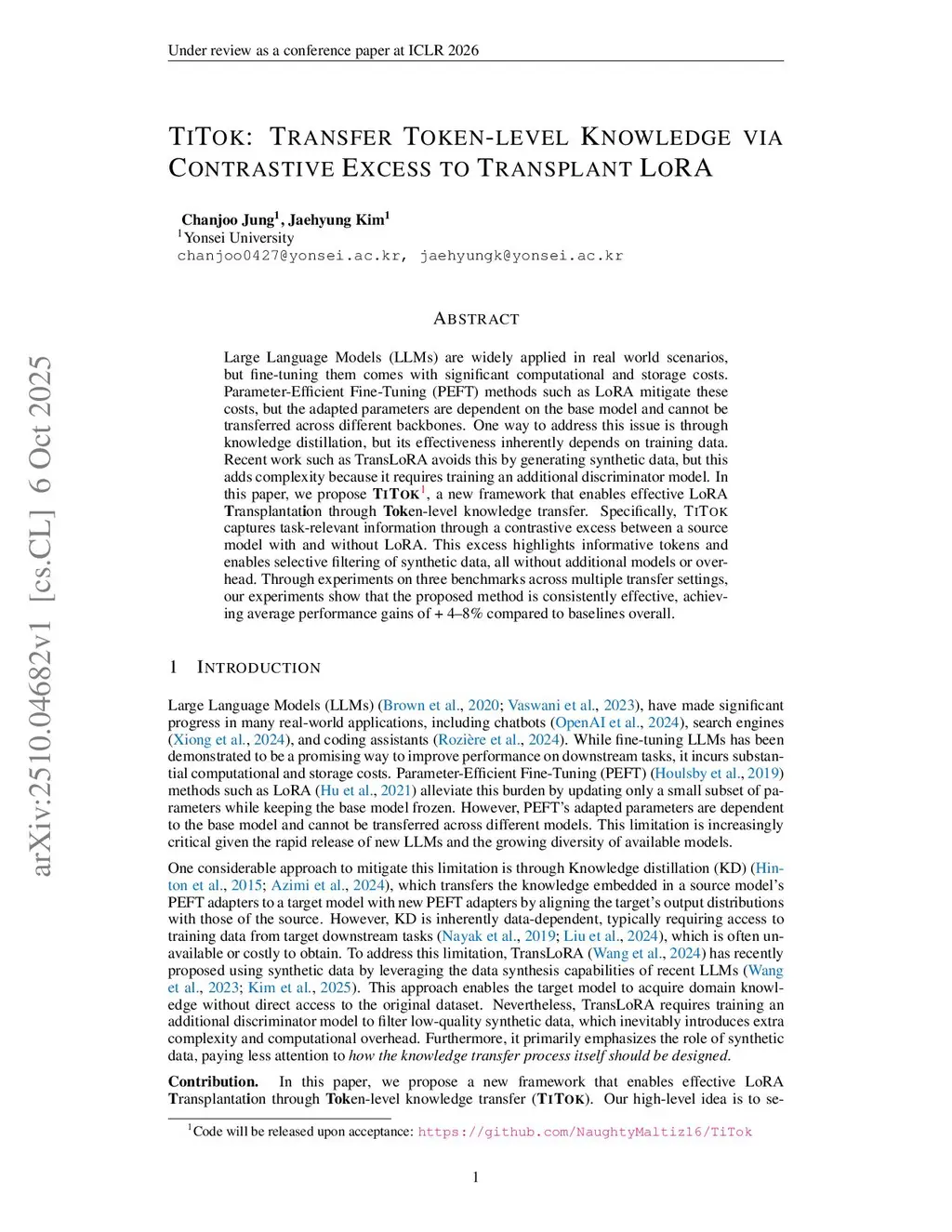 Large Language Models (LLMs) are widely applied in real world scenarios, but fine-tuning them comes with significant computational and storage costs. Parameter-Efficient Fine-Tuning (PEFT) methods such as LoRA mitigate these costs, but the adapted parameters are dependent on the base model and cannot be transferred across different backbones. One way to address this issue is through knowledge distillation, but its effectiveness inherently depends on training data. Recent work such as TransLoRA avoids this by generating synthetic data, but this adds complexity because it requires training an additional discriminator model. In this paper, we propose TiTok, a new framework that enables effective LoRA Transplantation through Token-level knowledge transfer. Specifically, TiTok captures task-relevant information through a contrastive excess between a source model with and without LoRA. This excess highlights informative tokens and enables selective filtering of synthetic data, all without additional models or overhead. Through experiments on three benchmarks across multiple transfer settings, our experiments show that the proposed method is consistently effective, achieving average performance gains of +4~8% compared to baselines overall.