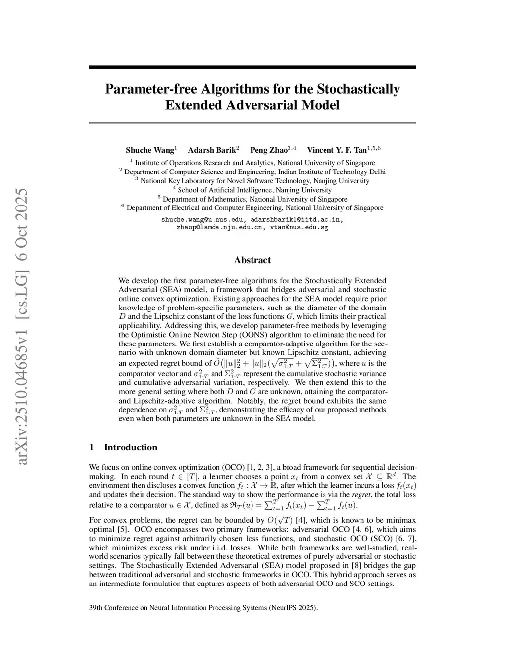 We develop the first parameter-free algorithms for the Stochastically Extended Adversarial (SEA) model, a framework that bridges adversarial and stochastic online convex optimization. Existing approaches for the SEA model require prior knowledge of problem-specific parameters, such as the diameter of the domain and the Lipschitz constant of the loss functions , which limits their practical applicability. Addressing this, we develop parameter-free methods by leveraging the Optimistic Online Newton Step (OONS) algorithm to eliminate the need for these parameters. We first establish a comparator-adaptive algorithm for the scenario with unknown domain diameter but known Lipschitz constant, achieving an expected regret bound of , where is the comparator vector and and represent the cumulative stochastic variance and cumulative adversarial variation, respectively. We then extend this to the more general setting where both and are unknown, attaining the comparator- and Lipschitz-adaptive algorithm. Notably, the regret bound exhibits the same dependence on and , demonstrating the efficacy of our proposed methods even when both parameters are unknown in the SEA model.