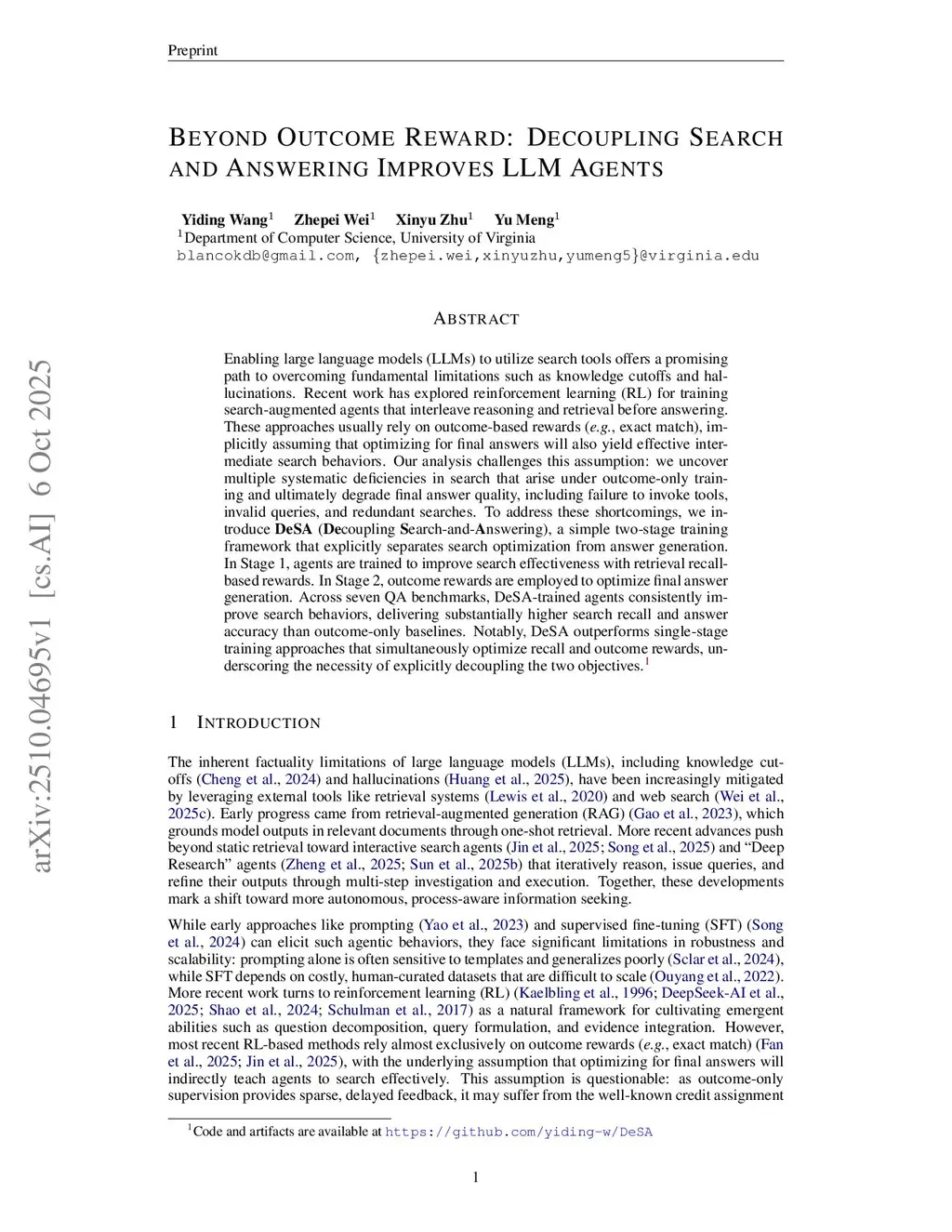 Beyond Outcome Reward: Decoupling Search and Answering Improves LLM Agents