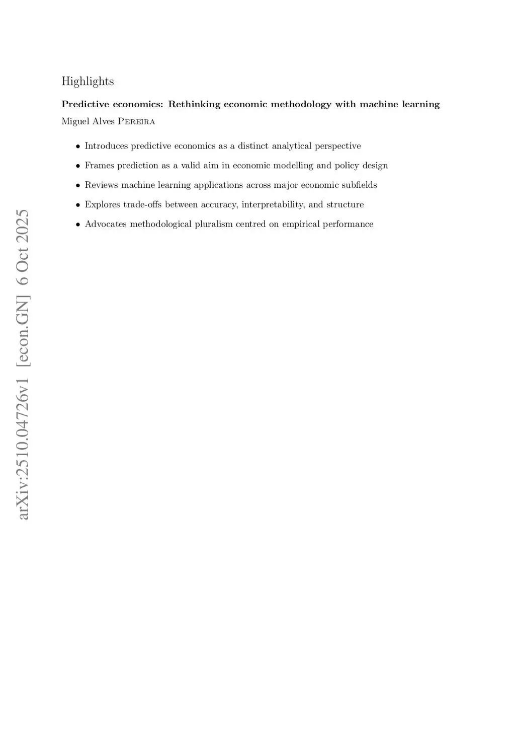 This article proposes predictive economics as a distinct analytical perspective within economics, grounded in machine learning and centred on predictive accuracy rather than causal identification. Drawing on the instrumentalist tradition (Friedman), the explanation-prediction divide (Shmueli), and the contrast between modelling cultures (Breiman), we formalise prediction as a valid epistemological and methodological objective. Reviewing recent applications across economic subfields, we show how predictive models contribute to empirical analysis, particularly in complex or data-rich contexts. This perspective complements existing approaches and supports a more pluralistic methodology - one that values out-of-sample performance alongside interpretability and theoretical structure.
