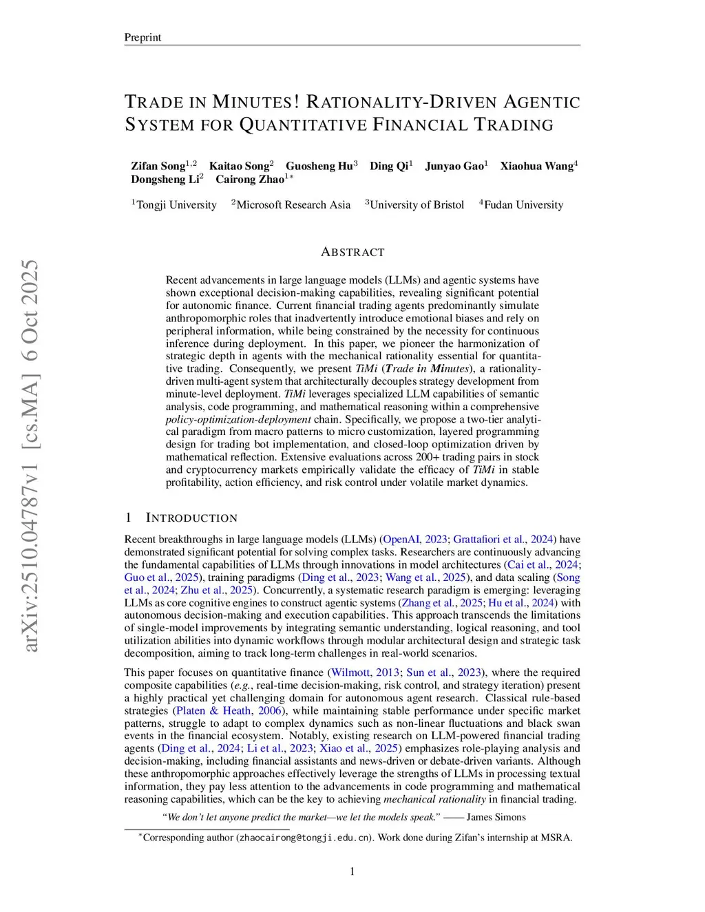 Recent advancements in large language models (LLMs) and agentic systems have shown exceptional decision-making capabilities, revealing significant potential for autonomic finance. Current financial trading agents predominantly simulate anthropomorphic roles that inadvertently introduce emotional biases and rely on peripheral information, while being constrained by the necessity for continuous inference during deployment. In this paper, we pioneer the harmonization of strategic depth in agents with the mechanical rationality essential for quantitative trading. Consequently, we present TiMi (Trade in Minutes), a rationality-driven multi-agent system that architecturally decouples strategy development from minute-level deployment. TiMi leverages specialized LLM capabilities of semantic analysis, code programming, and mathematical reasoning within a comprehensive policy-optimization-deployment chain. Specifically, we propose a two-tier analytical paradigm from macro patterns to micro customization, layered programming design for trading bot implementation, and closed-loop optimization driven by mathematical reflection. Extensive evaluations across 200+ trading pairs in stock and cryptocurrency markets empirically validate the efficacy of TiMi in stable profitability, action efficiency, and risk control under volatile market dynamics.