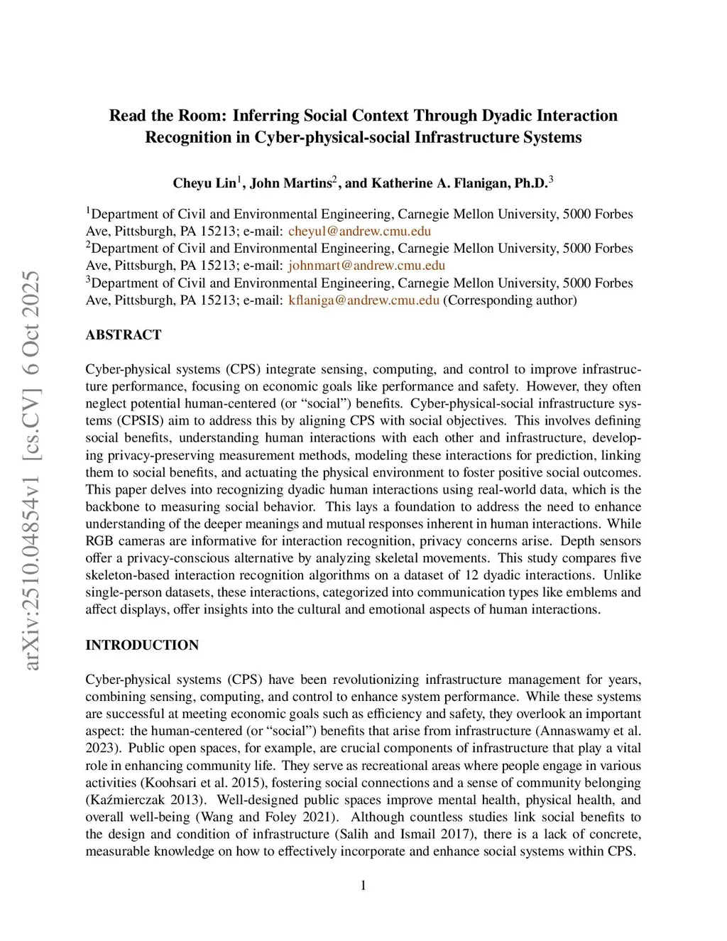 Cyber-physical systems (CPS) integrate sensing, computing, and control to improve infrastructure performance, focusing on economic goals like performance and safety. However, they often neglect potential human-centered (or ''social'') benefits. Cyber-physical-social infrastructure systems (CPSIS) aim to address this by aligning CPS with social objectives. This involves defining social benefits, understanding human interactions with each other and infrastructure, developing privacy-preserving measurement methods, modeling these interactions for prediction, linking them to social benefits, and actuating the physical environment to foster positive social outcomes. This paper delves into recognizing dyadic human interactions using real-world data, which is the backbone to measuring social behavior. This lays a foundation to address the need to enhance understanding of the deeper meanings and mutual responses inherent in human interactions. While RGB cameras are informative for interaction recognition, privacy concerns arise. Depth sensors offer a privacy-conscious alternative by analyzing skeletal movements. This study compares five skeleton-based interaction recognition algorithms on a dataset of 12 dyadic interactions. Unlike single-person datasets, these interactions, categorized into communication types like emblems and affect displays, offer insights into the cultural and emotional aspects of human interactions.