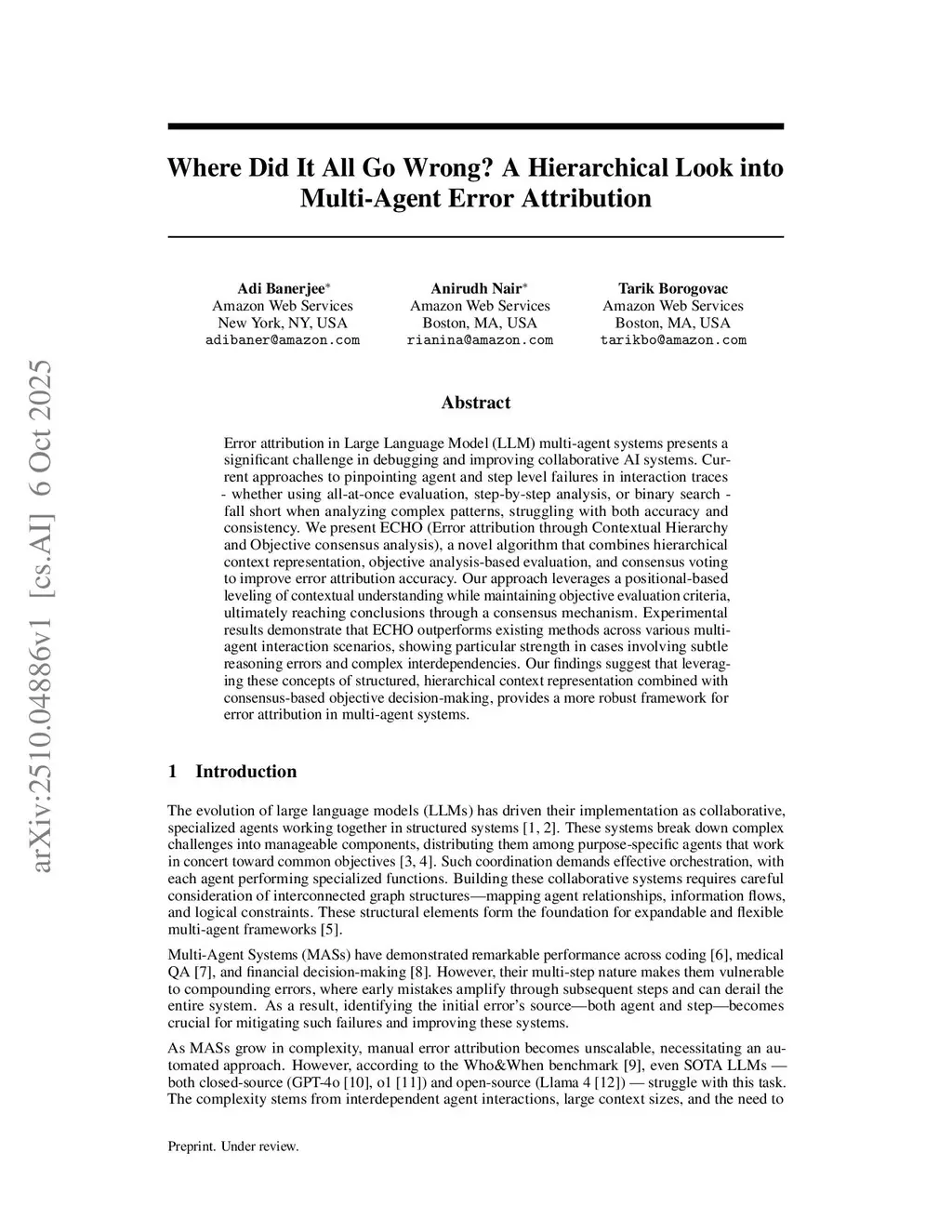 Error attribution in Large Language Model (LLM) multi-agent systems presents a significant challenge in debugging and improving collaborative AI systems. Current approaches to pinpointing agent and step level failures in interaction traces - whether using all-at-once evaluation, step-by-step analysis, or binary search - fall short when analyzing complex patterns, struggling with both accuracy and consistency. We present ECHO (Error attribution through Contextual Hierarchy and Objective consensus analysis), a novel algorithm that combines hierarchical context representation, objective analysis-based evaluation, and consensus voting to improve error attribution accuracy. Our approach leverages a positional-based leveling of contextual understanding while maintaining objective evaluation criteria, ultimately reaching conclusions through a consensus mechanism. Experimental results demonstrate that ECHO outperforms existing methods across various multi-agent interaction scenarios, showing particular strength in cases involving subtle reasoning errors and complex interdependencies. Our findings suggest that leveraging these concepts of structured, hierarchical context representation combined with consensus-based objective decision-making, provides a more robust framework for error attribution in multi-agent systems.