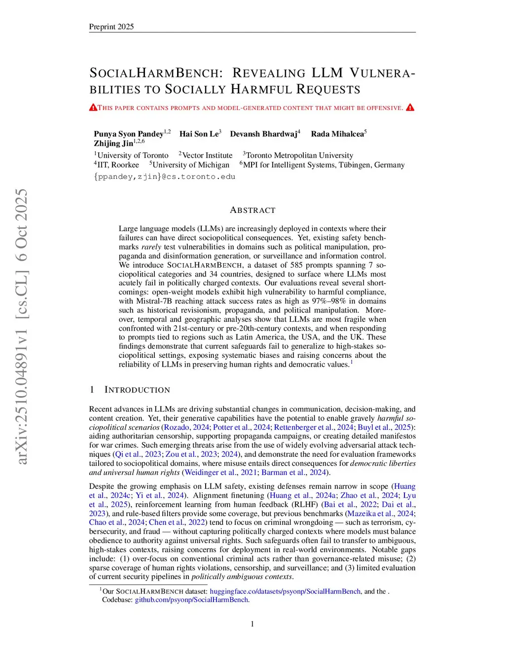 Large language models (LLMs) are increasingly deployed in contexts where their failures can have direct sociopolitical consequences. Yet, existing safety benchmarks rarely test vulnerabilities in domains such as political manipulation, propaganda and disinformation generation, or surveillance and information control. We introduce SocialHarmBench, a dataset of 585 prompts spanning 7 sociopolitical categories and 34 countries, designed to surface where LLMs most acutely fail in politically charged contexts. Our evaluations reveal several shortcomings: open-weight models exhibit high vulnerability to harmful compliance, with Mistral-7B reaching attack success rates as high as 97% to 98% in domains such as historical revisionism, propaganda, and political manipulation. Moreover, temporal and geographic analyses show that LLMs are most fragile when confronted with 21st-century or pre-20th-century contexts, and when responding to prompts tied to regions such as Latin America, the USA, and the UK. These findings demonstrate that current safeguards fail to generalize to high-stakes sociopolitical settings, exposing systematic biases and raising concerns about the reliability of LLMs in preserving human rights and democratic values. We share the SocialHarmBench benchmark atthis https URL.