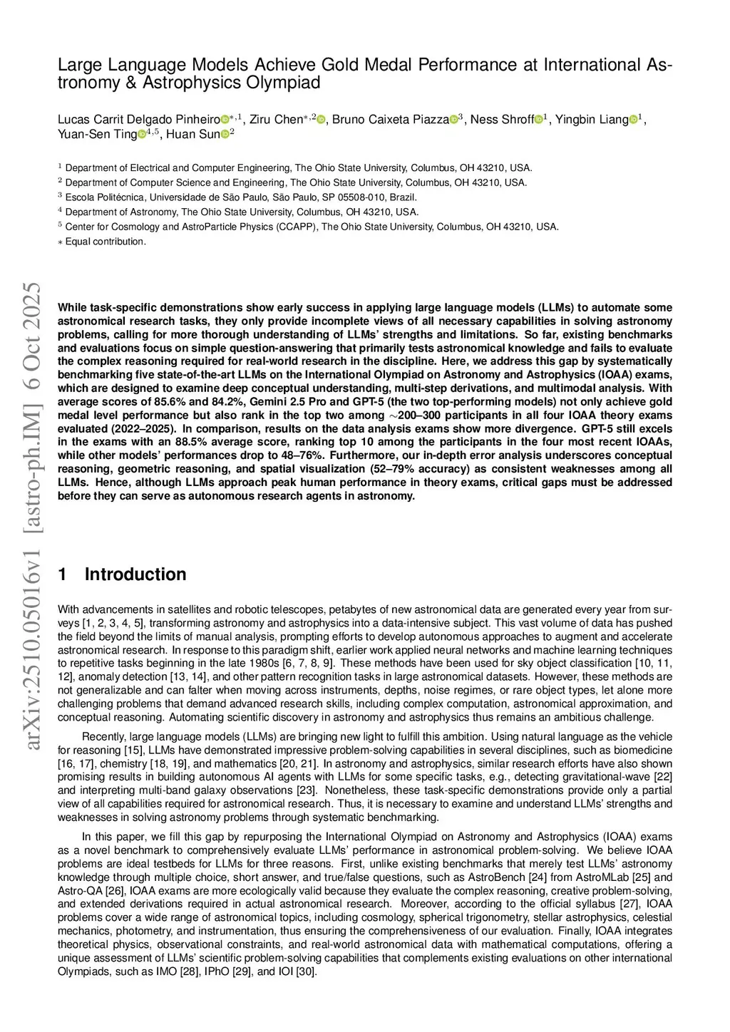 While task-specific demonstrations show early success in applying large language models (LLMs) to automate some astronomical research tasks, they only provide incomplete views of all necessary capabilities in solving astronomy problems, calling for more thorough understanding of LLMs' strengths and limitations. So far, existing benchmarks and evaluations focus on simple question-answering that primarily tests astronomical knowledge and fails to evaluate the complex reasoning required for real-world research in the discipline. Here, we address this gap by systematically benchmarking five state-of-the-art LLMs on the International Olympiad on Astronomy and Astrophysics (IOAA) exams, which are designed to examine deep conceptual understanding, multi-step derivations, and multimodal analysis. With average scores of 85.6% and 84.2%, Gemini 2.5 Pro and GPT-5 (the two top-performing models) not only achieve gold medal level performance but also rank in the top two among ~200-300 participants in all four IOAA theory exams evaluated (2022-2025). In comparison, results on the data analysis exams show more divergence. GPT-5 still excels in the exams with an 88.5% average score, ranking top 10 among the participants in the four most recent IOAAs, while other models' performances drop to 48-76%. Furthermore, our in-depth error analysis underscores conceptual reasoning, geometric reasoning, and spatial visualization (52-79% accuracy) as consistent weaknesses among all LLMs. Hence, although LLMs approach peak human performance in theory exams, critical gaps must be addressed before they can serve as autonomous research agents in astronomy.