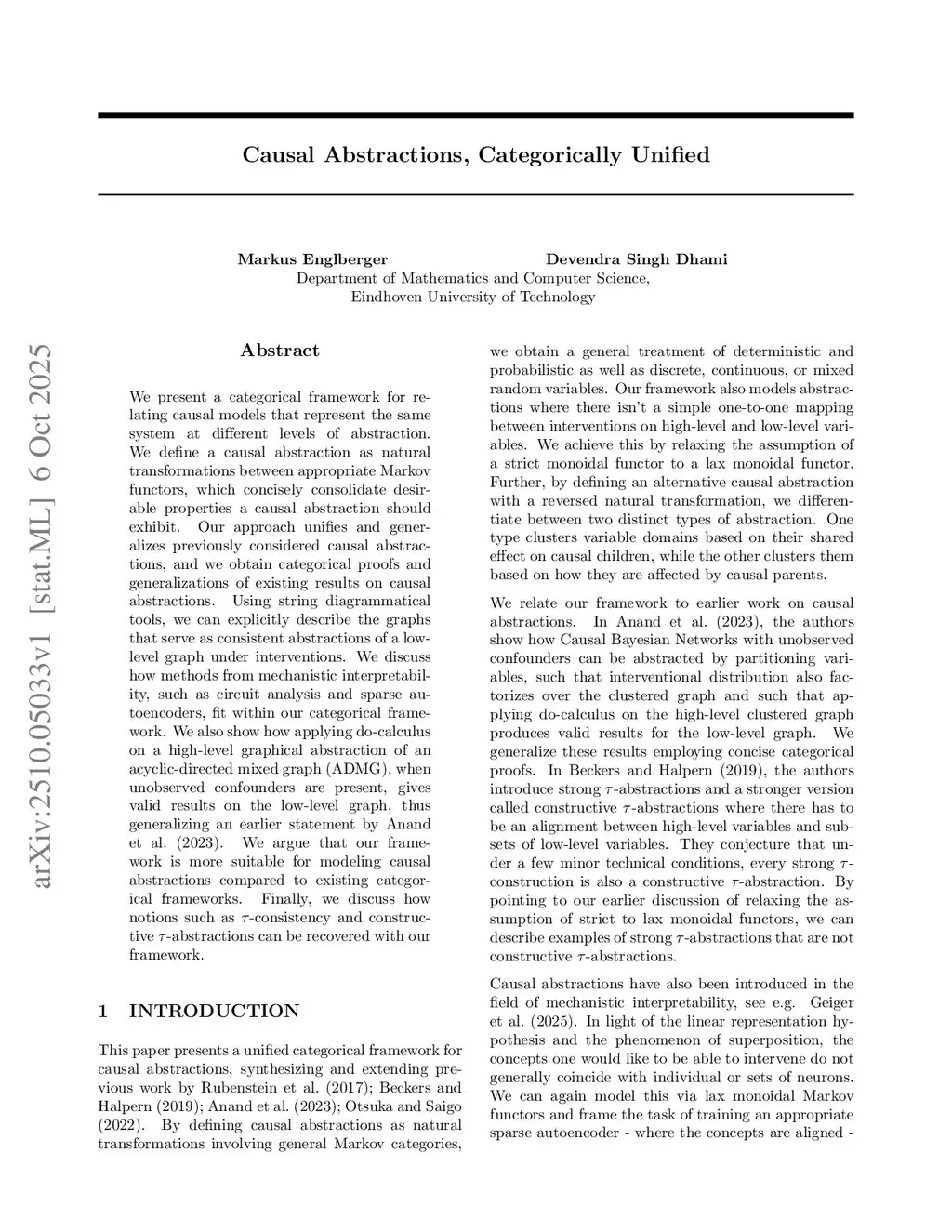 We present a categorical framework for relating causal models that represent the same system at different levels of abstraction. We define a causal abstraction as natural transformations between appropriate Markov functors, which concisely consolidate desirable properties a causal abstraction should exhibit. Our approach unifies and generalizes previously considered causal abstractions, and we obtain categorical proofs and generalizations of existing results on causal abstractions. Using string diagrammatical tools, we can explicitly describe the graphs that serve as consistent abstractions of a low-level graph under interventions. We discuss how methods from mechanistic interpretability, such as circuit analysis and sparse autoencoders, fit within our categorical framework. We also show how applying do-calculus on a high-level graphical abstraction of an acyclic-directed mixed graph (ADMG), when unobserved confounders are present, gives valid results on the low-level graph, thus generalizing an earlier statement by Anand et al. (2023). We argue that our framework is more suitable for modeling causal abstractions compared to existing categorical frameworks. Finally, we discuss how notions such as -consistency and constructive -abstractions can be recovered with our framework.