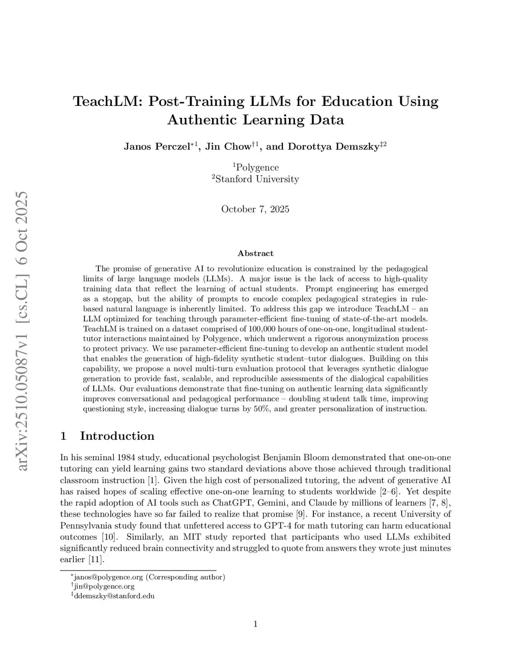 The promise of generative AI to revolutionize education is constrained by the pedagogical limits of large language models (LLMs). A major issue is the lack of access to high-quality training data that reflect the learning of actual students. Prompt engineering has emerged as a stopgap, but the ability of prompts to encode complex pedagogical strategies in rule-based natural language is inherently limited. To address this gap we introduce TeachLM - an LLM optimized for teaching through parameter-efficient fine-tuning of state-of-the-art models. TeachLM is trained on a dataset comprised of 100,000 hours of one-on-one, longitudinal student-tutor interactions maintained by Polygence, which underwent a rigorous anonymization process to protect privacy. We use parameter-efficient fine-tuning to develop an authentic student model that enables the generation of high-fidelity synthetic student-tutor dialogues. Building on this capability, we propose a novel multi-turn evaluation protocol that leverages synthetic dialogue generation to provide fast, scalable, and reproducible assessments of the dialogical capabilities of LLMs. Our evaluations demonstrate that fine-tuning on authentic learning data significantly improves conversational and pedagogical performance - doubling student talk time, improving questioning style, increasing dialogue turns by 50%, and greater personalization of instruction.