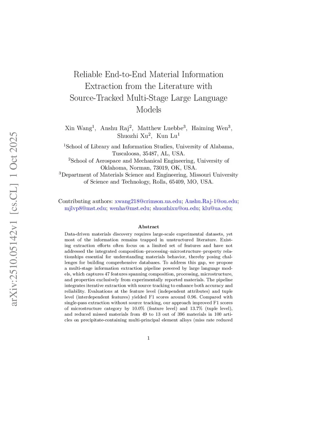 Data-driven materials discovery requires large-scale experimental datasets, yet most of the information remains trapped in unstructured literature. Existing extraction efforts often focus on a limited set of features and have not addressed the integrated composition-processing-microstructure-property relationships essential for understanding materials behavior, thereby posing challenges for building comprehensive databases. To address this gap, we propose a multi-stage information extraction pipeline powered by large language models, which captures 47 features spanning composition, processing, microstructure, and properties exclusively from experimentally reported materials. The pipeline integrates iterative extraction with source tracking to enhance both accuracy and reliability. Evaluations at the feature level (independent attributes) and tuple level (interdependent features) yielded F1 scores around 0.96. Compared with single-pass extraction without source tracking, our approach improved F1 scores of microstructure category by 10.0% (feature level) and 13.7% (tuple level), and reduced missed materials from 49 to 13 out of 396 materials in 100 articles on precipitate-containing multi-principal element alloys (miss rate reduced from 12.4% to 3.3%). The pipeline enables scalable and efficient literature mining, producing databases with high precision, minimal omissions, and zero false positives. These datasets provide trustworthy inputs for machine learning and materials informatics, while the modular design generalizes to diverse material classes, enabling comprehensive materials information extraction.