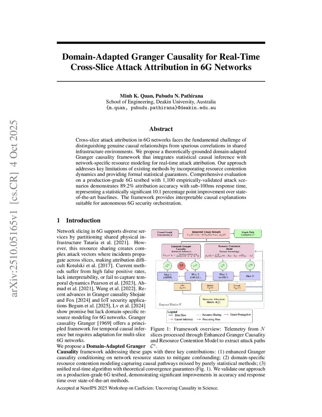 Cross-slice attack attribution in 6G networks faces the fundamental challenge of distinguishing genuine causal relationships from spurious correlations in shared infrastructure environments. We propose a theoretically-grounded domain-adapted Granger causality framework that integrates statistical causal inference with network-specific resource modeling for real-time attack attribution. Our approach addresses key limitations of existing methods by incorporating resource contention dynamics and providing formal statistical guarantees. Comprehensive evaluation on a production-grade 6G testbed with 1,100 empirically-validated attack scenarios demonstrates 89.2% attribution accuracy with sub-100ms response time, representing a statistically significant 10.1 percentage point improvement over state-of-the-art baselines. The framework provides interpretable causal explanations suitable for autonomous 6G security orchestration.