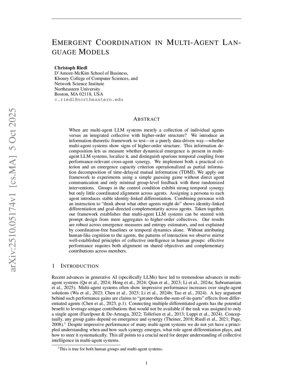 When are multi-agent LLM systems merely a collection of individual agents versus an integrated collective with higher-order structure? We introduce an information-theoretic framework to test -- in a purely data-driven way -- whether multi-agent systems show signs of higher-order structure. This information decomposition lets us measure whether dynamical emergence is present in multi-agent LLM systems, localize it, and distinguish spurious temporal coupling from performance-relevant cross-agent synergy. We implement both a practical criterion and an emergence capacity criterion operationalized as partial information decomposition of time-delayed mutual information (TDMI). We apply our framework to experiments using a simple guessing game without direct agent communication and only minimal group-level feedback with three randomized interventions. Groups in the control condition exhibit strong temporal synergy but only little coordinated alignment across agents. Assigning a persona to each agent introduces stable identity-linked differentiation. Combining personas with an instruction to ``think about what other agents might do'' shows identity-linked differentiation and goal-directed complementarity across agents. Taken together, our framework establishes that multi-agent LLM systems can be steered with prompt design from mere aggregates to higher-order collectives. Our results are robust across emergence measures and entropy estimators, and not explained by coordination-free baselines or temporal dynamics alone. Without attributing human-like cognition to the agents, the patterns of interaction we observe mirror well-established principles of collective intelligence in human groups: effective performance requires both alignment on shared objectives and complementary contributions across members.