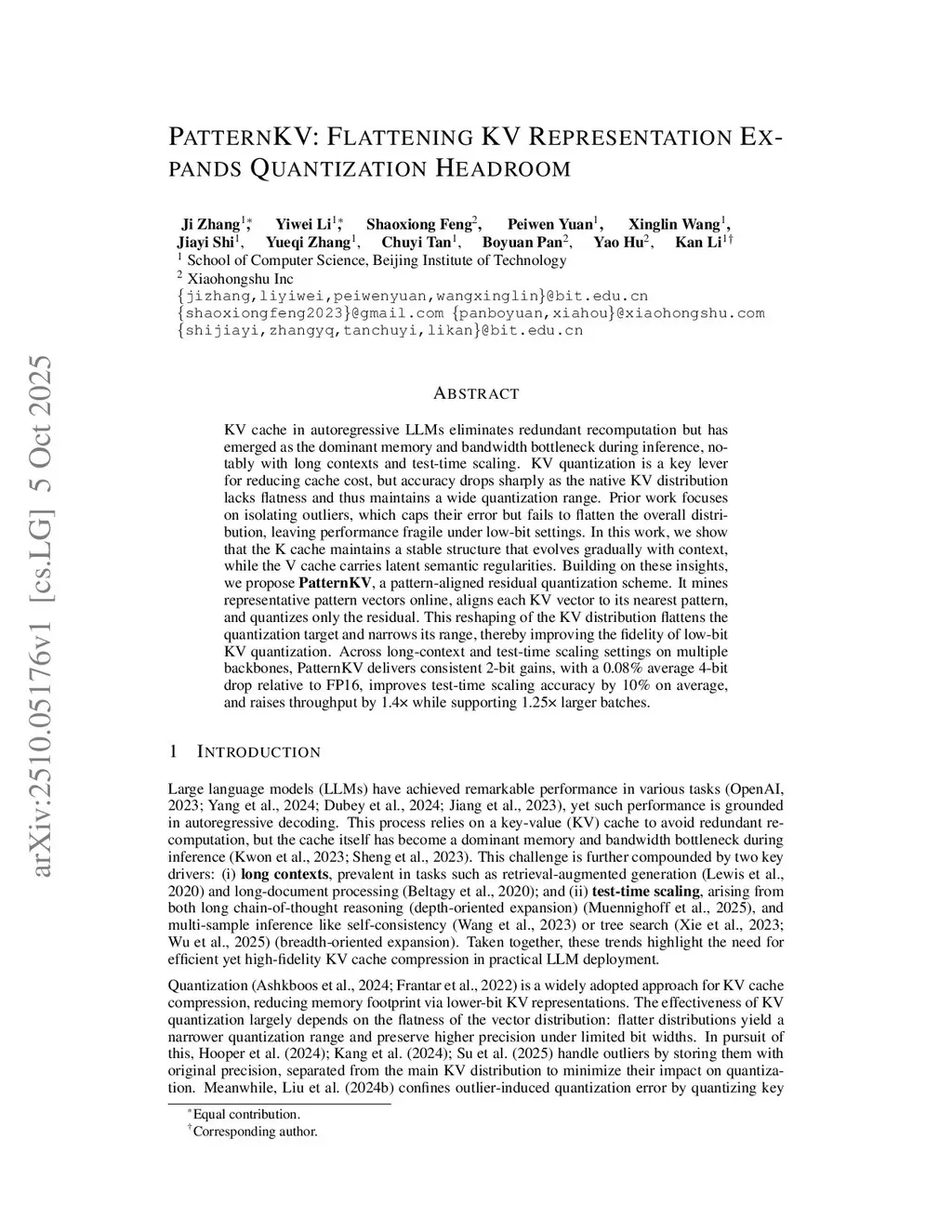 KV cache in autoregressive LLMs eliminates redundant recomputation but has emerged as the dominant memory and bandwidth bottleneck during inference, notably with long contexts and test-time scaling. KV quantization is a key lever for reducing cache cost, but accuracy drops sharply as the native KV distribution lacks flatness and thus maintains a wide quantization range. Prior work focuses on isolating outliers, which caps their error but fails to flatten the overall distribution, leaving performance fragile under low-bit settings. In this work, we show that the K cache maintains a stable structure that evolves gradually with context, while the V cache carries latent semantic regularities. Building on these insights, we propose PatternKV, a pattern-aligned residual quantization scheme. It mines representative pattern vectors online, aligns each KV vector to its nearest pattern, and quantizes only the residual. This reshaping of the KV distribution flattens the quantization target and narrows its range, thereby improving the fidelity of low-bit KV quantization. Across long-context and test-time scaling settings on multiple backbones, PatternKV delivers consistent 2-bit gains, with a 0.08% average 4-bit drop relative to FP16, improves test-time scaling accuracy by 10% on average, and raises throughput by 1.4x while supporting 1.25x larger batches.