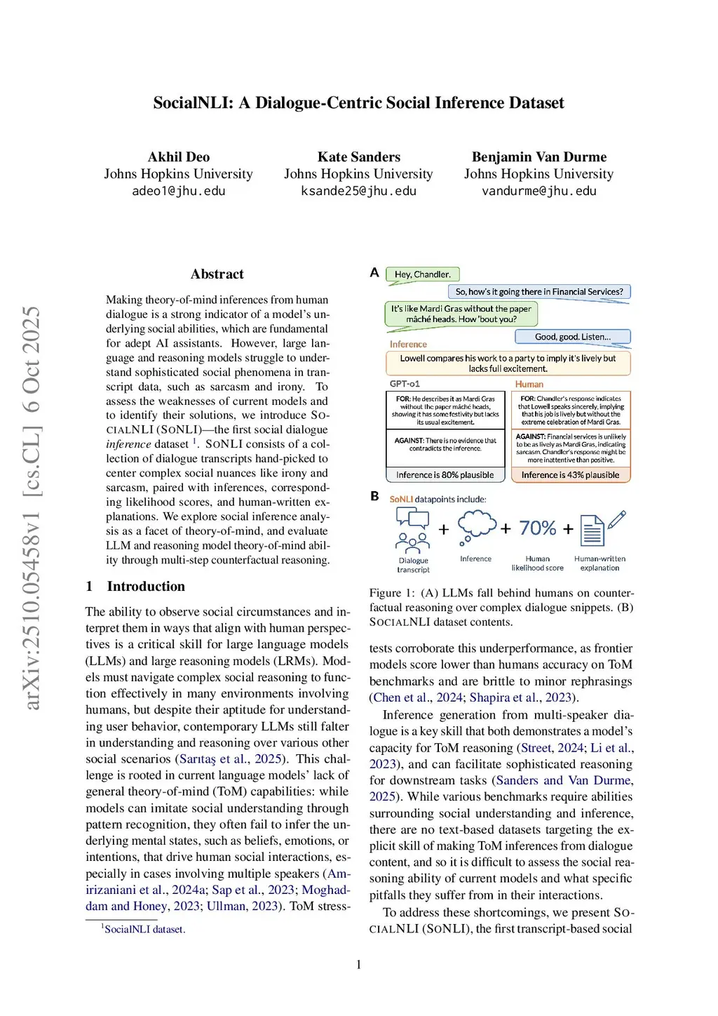 Making theory-of-mind inferences from human dialogue is a strong indicator of a model's underlying social abilities, which are fundamental for adept AI assistants. However, large language and reasoning models struggle to understand sophisticated social phenomena in transcript data, such as sarcasm and irony. To assess the weaknesses of current models and to identify their solutions, we introduce SocialNLI (SoNLI) -- the first social dialogue inference dataset. SoNLI consists of a collection of dialogue transcripts hand-picked to center complex social nuances like irony and sarcasm, paired with inferences, corresponding likelihood scores, and human-written explanations. We explore social inference analysis as a facet of theory-of-mind, and evaluate LLM and reasoning model theory-of-mind ability through multi-step counterfactual reasoning.