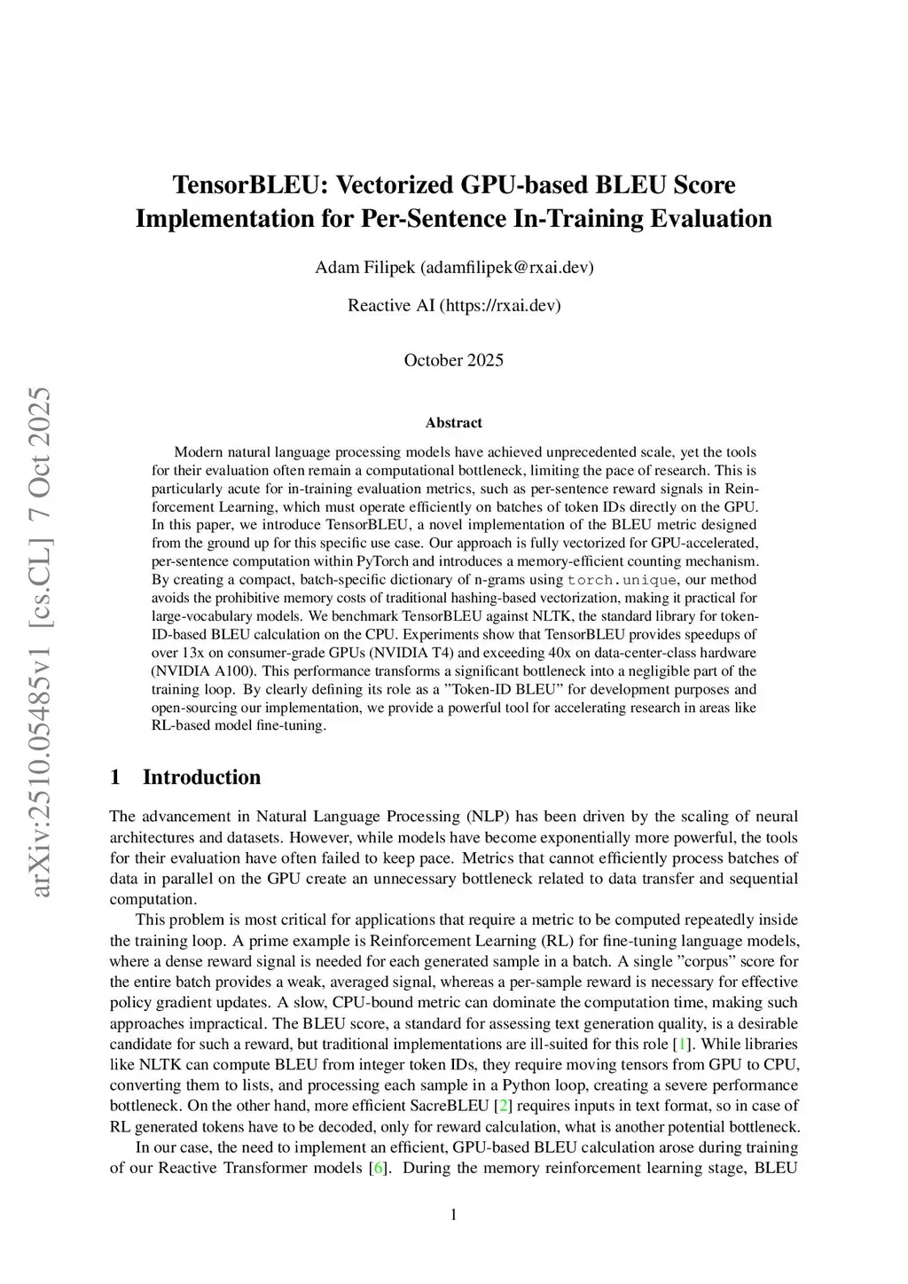 TensorBLEU: Vectorized GPU-based BLEU Score Implementation for Per-Sentence In-Training Evaluation