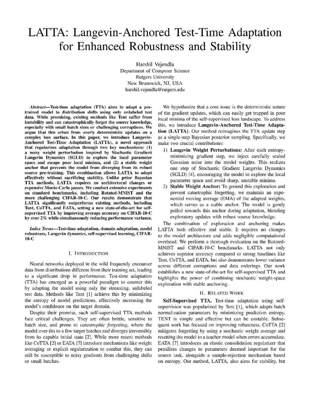 Test-time adaptation (TTA) aims to adapt a pretrained model to distribution shifts using only unlabeled test data. While promising, existing methods like Tent suffer from instability and can catastrophically forget the source knowledge, especially with small batch sizes or challenging corruptions. We argue that this arises from overly deterministic updates on a complex loss surface. In this paper, we introduce Langevin-Anchored Test-Time Adaptation (LATTA), a novel approach that regularizes adaptation through two key mechanisms: (1) a noisy weight perturbation inspired by Stochastic Gradient Langevin Dynamics (SGLD) to explore the local parameter space and escape poor local minima, and (2) a stable weight anchor that prevents the model from diverging from its robust source pre-training. This combination allows LATTA to adapt effectively without sacrificing stability. Unlike prior Bayesian TTA methods, LATTA requires no architectural changes or expensive Monte Carlo passes. We conduct extensive experiments on standard benchmarks, including Rotated-MNIST and the more challenging CIFAR-10-C. Our results demonstrate that LATTA significantly outperforms existing methods, including Tent, CoTTA, and EATA, setting a new state of the art for self-supervised TTA by improving average accuracy on CIFAR-10-C by over 2% while simultaneously reducing performance variance.