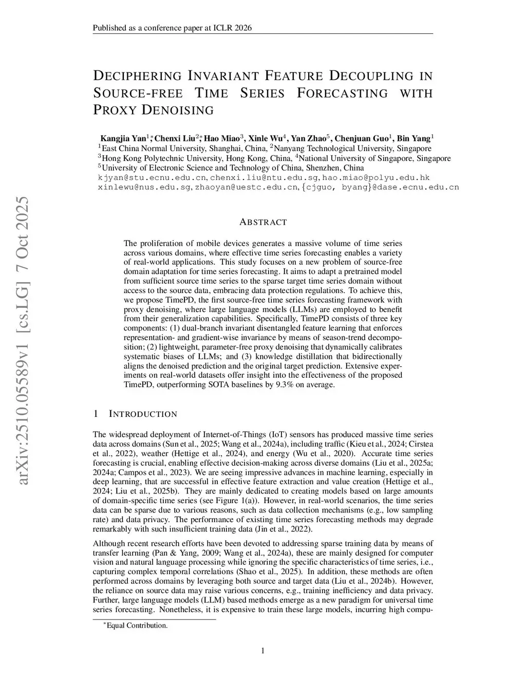 The proliferation of mobile devices generates a massive volume of time series across various domains, where effective time series forecasting enables a variety of real-world applications. This study focuses on a new problem of source-free domain adaptation for time series forecasting. It aims to adapt a pretrained model from sufficient source time series to the sparse target time series domain without access to the source data, embracing data protection regulations. To achieve this, we propose TimePD, the first source-free time series forecasting framework with proxy denoising, where large language models (LLMs) are employed to benefit from their generalization capabilities. Specifically, TimePD consists of three key components: (1) dual-branch invariant disentangled feature learning that enforces representation- and gradient-wise invariance by means of season-trend decomposition; (2) lightweight, parameter-free proxy denoising that dynamically calibrates systematic biases of LLMs; and (3) knowledge distillation that bidirectionally aligns the denoised prediction and the original target prediction. Extensive experiments on real-world datasets offer insight into the effectiveness of the proposed TimePD, outperforming SOTA baselines by 9.3% on average.