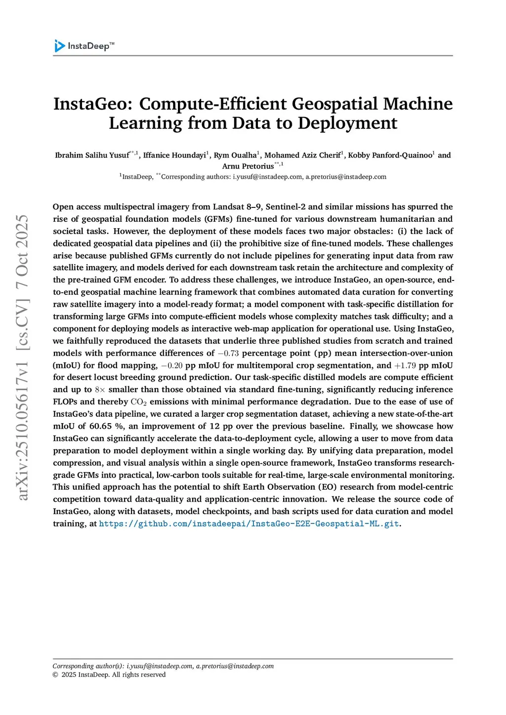 InstaGeo: Compute-Efficient Geospatial Machine Learning from Data to Deployment
