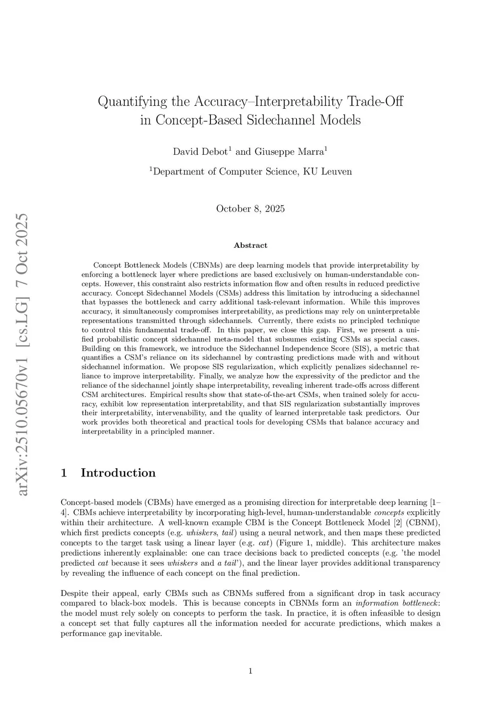 Concept Bottleneck Models (CBNMs) are deep learning models that provide interpretability by enforcing a bottleneck layer where predictions are based exclusively on human-understandable concepts. However, this constraint also restricts information flow and often results in reduced predictive accuracy. Concept Sidechannel Models (CSMs) address this limitation by introducing a sidechannel that bypasses the bottleneck and carry additional task-relevant information. While this improves accuracy, it simultaneously compromises interpretability, as predictions may rely on uninterpretable representations transmitted through sidechannels. Currently, there exists no principled technique to control this fundamental trade-off. In this paper, we close this gap. First, we present a unified probabilistic concept sidechannel meta-model that subsumes existing CSMs as special cases. Building on this framework, we introduce the Sidechannel Independence Score (SIS), a metric that quantifies a CSM's reliance on its sidechannel by contrasting predictions made with and without sidechannel information. We propose SIS regularization, which explicitly penalizes sidechannel reliance to improve interpretability. Finally, we analyze how the expressivity of the predictor and the reliance of the sidechannel jointly shape interpretability, revealing inherent trade-offs across different CSM architectures. Empirical results show that state-of-the-art CSMs, when trained solely for accuracy, exhibit low representation interpretability, and that SIS regularization substantially improves their interpretability, intervenability, and the quality of learned interpretable task predictors. Our work provides both theoretical and practical tools for developing CSMs that balance accuracy and interpretability in a principled manner.