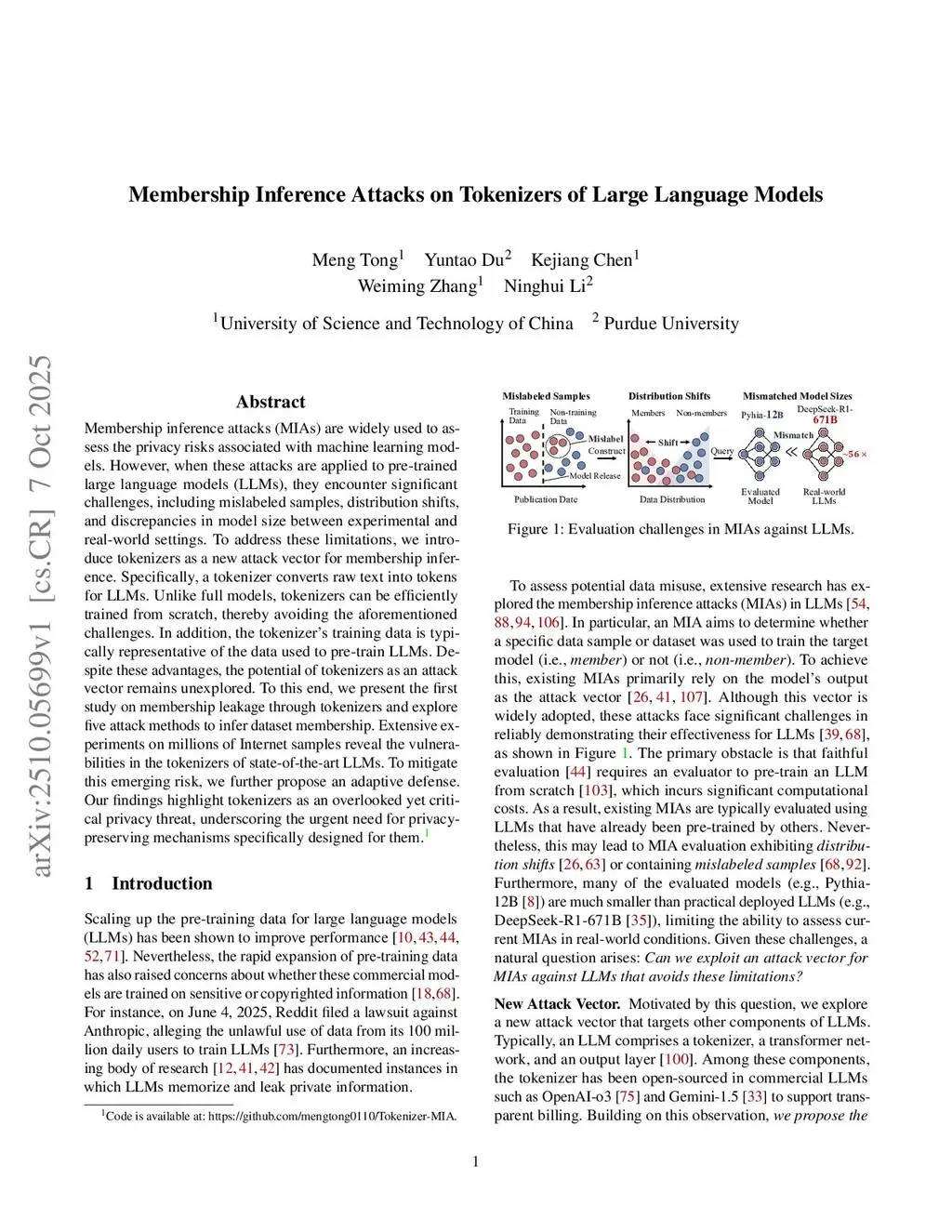 Membership inference attacks (MIAs) are widely used to assess the privacy risks associated with machine learning models. However, when these attacks are applied to pre-trained large language models (LLMs), they encounter significant challenges, including mislabeled samples, distribution shifts, and discrepancies in model size between experimental and real-world settings. To address these limitations, we introduce tokenizers as a new attack vector for membership inference. Specifically, a tokenizer converts raw text into tokens for LLMs. Unlike full models, tokenizers can be efficiently trained from scratch, thereby avoiding the aforementioned challenges. In addition, the tokenizer's training data is typically representative of the data used to pre-train LLMs. Despite these advantages, the potential of tokenizers as an attack vector remains unexplored. To this end, we present the first study on membership leakage through tokenizers and explore five attack methods to infer dataset membership. Extensive experiments on millions of Internet samples reveal the vulnerabilities in the tokenizers of state-of-the-art LLMs. To mitigate this emerging risk, we further propose an adaptive defense. Our findings highlight tokenizers as an overlooked yet critical privacy threat, underscoring the urgent need for privacy-preserving mechanisms specifically designed for them.