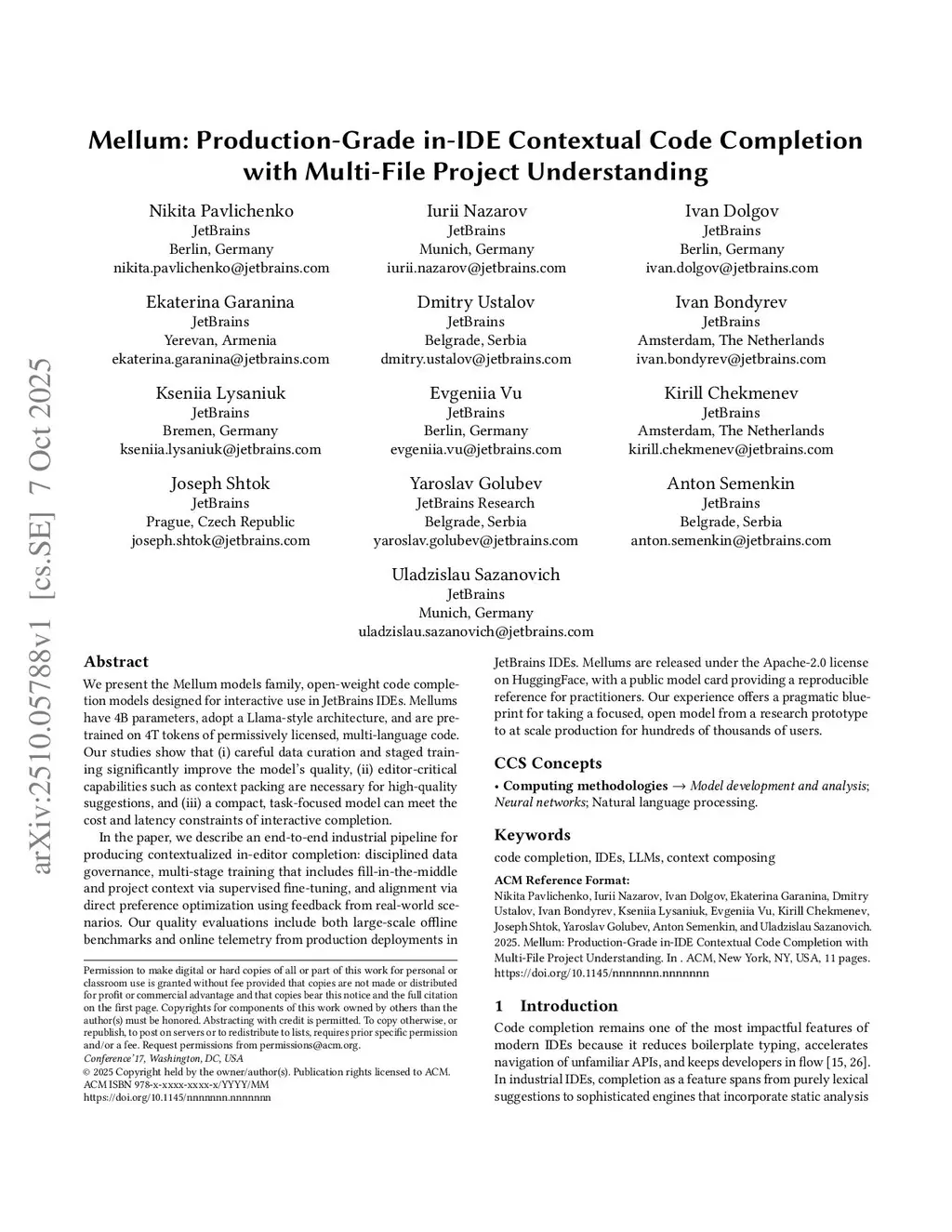We present the Mellum models family, open-weight code completion models designed for interactive use in JetBrains IDEs. Mellums have 4B parameters, adopt a Llama-style architecture, and are pre-trained on ~4T tokens of permissively licensed, multi-language code. Our studies show that (i) careful data curation and staged training significantly improve the model's quality, (ii) editor-critical capabilities such as context packing are necessary for high-quality suggestions, and (iii) a compact, task-focused model can meet the cost and latency constraints of interactive completion.In the paper, we describe an end-to-end industrial pipeline for producing contextualized in-editor completion: disciplined data governance, multi-stage training that includes fill-in-the-middle and project context via supervised fine-tuning, and alignment via direct preference optimization using feedback from real-world scenarios. Our quality evaluations include both large-scale offline benchmarks and online telemetry from production deployments in JetBrains IDEs. Mellums are released under the Apache-2.0 license on HuggingFace, with a public model card providing a reproducible reference for practitioners. Our experience offers a pragmatic blueprint for taking a focused, open model from a research prototype to at scale production for hundreds of thousands of users.