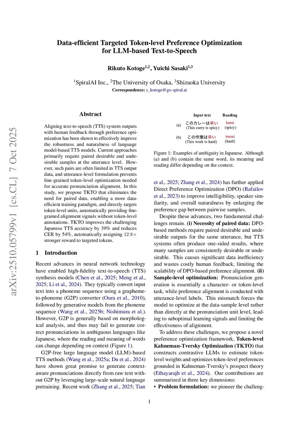Aligning text-to-speech (TTS) system outputs with human feedback through preference optimization has been shown to effectively improve the robustness and naturalness of language model-based TTS models. Current approaches primarily require paired desirable and undesirable samples at the utterance level. However, such pairs are often limited in TTS output data, and utterance-level formulation prevents fine-grained token-level optimization needed for accurate pronunciation alignment. In this study, we propose TKTO that eliminates the need for paired data, enabling a more data-efficient training paradigm, and directly targets token-level units, automatically providing fine-grained alignment signals without token-level annotations. TKTO improves the challenging Japanese TTS accuracy by 39% and reduces CER by 54%, automatically assigning 12.8 times stronger reward to targeted tokens.