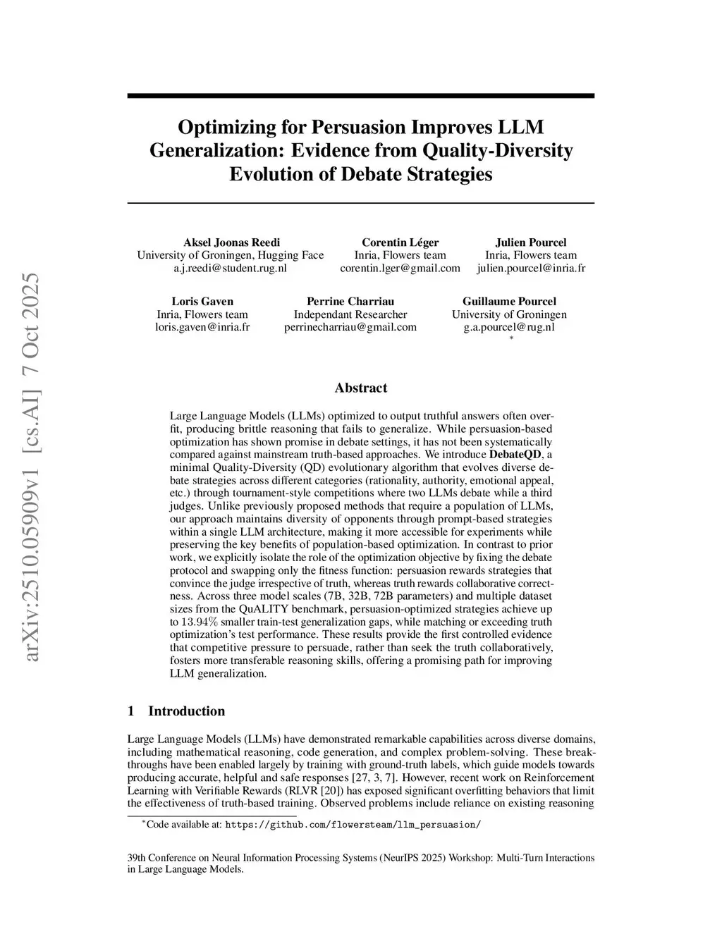Large Language Models (LLMs) optimized to output truthful answers often overfit, producing brittle reasoning that fails to generalize. While persuasion-based optimization has shown promise in debate settings, it has not been systematically compared against mainstream truth-based approaches. We introduce DebateQD, a minimal Quality-Diversity (QD) evolutionary algorithm that evolves diverse debate strategies across different categories (rationality, authority, emotional appeal, etc.) through tournament-style competitions where two LLMs debate while a third judges. Unlike previously proposed methods that require a population of LLMs, our approach maintains diversity of opponents through prompt-based strategies within a single LLM architecture, making it more accessible for experiments while preserving the key benefits of population-based optimization. In contrast to prior work, we explicitly isolate the role of the optimization objective by fixing the debate protocol and swapping only the fitness function: persuasion rewards strategies that convince the judge irrespective of truth, whereas truth rewards collaborative correctness. Across three model scales (7B, 32B, 72B parameters) and multiple dataset sizes from the QuALITY benchmark, persuasion-optimized strategies achieve up to 13.94% smaller train-test generalization gaps, while matching or exceeding truth optimization's test performance. These results provide the first controlled evidence that competitive pressure to persuade, rather than seek the truth collaboratively, fosters more transferable reasoning skills, offering a promising path for improving LLM generalization.