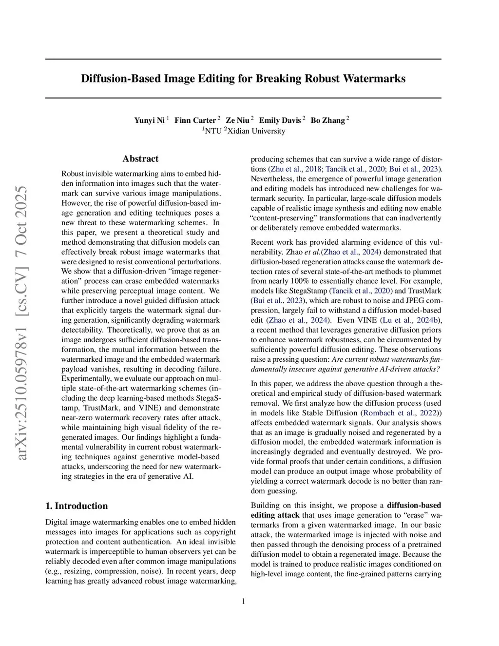 Robust invisible watermarking aims to embed hidden information into images such that the watermark can survive various image manipulations. However, the rise of powerful diffusion-based image generation and editing techniques poses a new threat to these watermarking schemes. In this paper, we present a theoretical study and method demonstrating that diffusion models can effectively break robust image watermarks that were designed to resist conventional perturbations. We show that a diffusion-driven ``image regeneration'' process can erase embedded watermarks while preserving perceptual image content. We further introduce a novel guided diffusion attack that explicitly targets the watermark signal during generation, significantly degrading watermark detectability. Theoretically, we prove that as an image undergoes sufficient diffusion-based transformation, the mutual information between the watermarked image and the embedded watermark payload vanishes, resulting in decoding failure. Experimentally, we evaluate our approach on multiple state-of-the-art watermarking schemes (including the deep learning-based methods StegaStamp, TrustMark, and VINE) and demonstrate near-zero watermark recovery rates after attack, while maintaining high visual fidelity of the regenerated images. Our findings highlight a fundamental vulnerability in current robust watermarking techniques against generative model-based attacks, underscoring the need for new watermarking strategies in the era of generative AI.