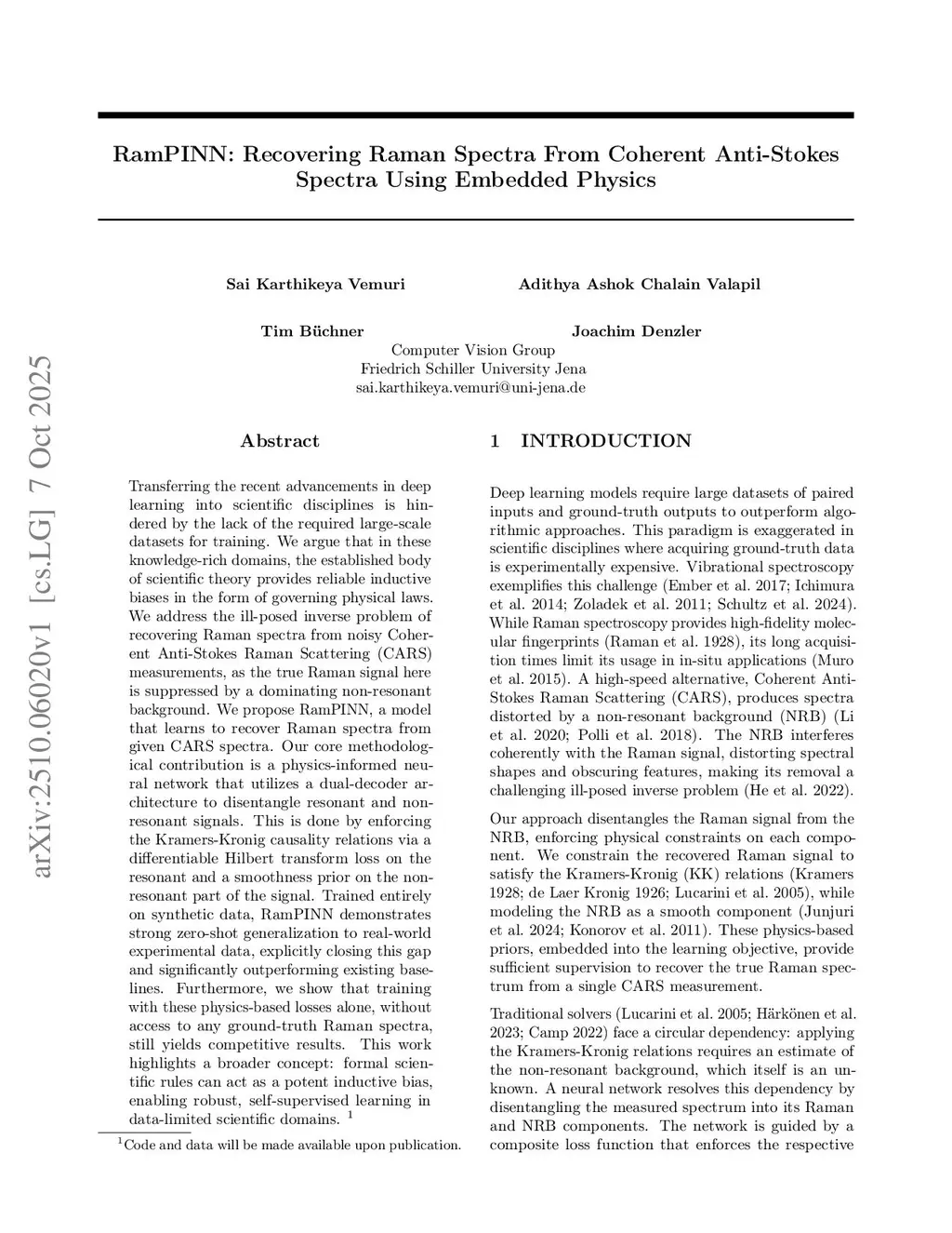 Transferring the recent advancements in deep learning into scientific disciplines is hindered by the lack of the required large-scale datasets for training. We argue that in these knowledge-rich domains, the established body of scientific theory provides reliable inductive biases in the form of governing physical laws. We address the ill-posed inverse problem of recovering Raman spectra from noisy Coherent Anti-Stokes Raman Scattering (CARS) measurements, as the true Raman signal here is suppressed by a dominating non-resonant background. We propose RamPINN, a model that learns to recover Raman spectra from given CARS spectra. Our core methodological contribution is a physics-informed neural network that utilizes a dual-decoder architecture to disentangle resonant and non-resonant signals. This is done by enforcing the Kramers-Kronig causality relations via a differentiable Hilbert transform loss on the resonant and a smoothness prior on the non-resonant part of the signal. Trained entirely on synthetic data, RamPINN demonstrates strong zero-shot generalization to real-world experimental data, explicitly closing this gap and significantly outperforming existing baselines. Furthermore, we show that training with these physics-based losses alone, without access to any ground-truth Raman spectra, still yields competitive results. This work highlights a broader concept: formal scientific rules can act as a potent inductive bias, enabling robust, self-supervised learning in data-limited scientific domains.