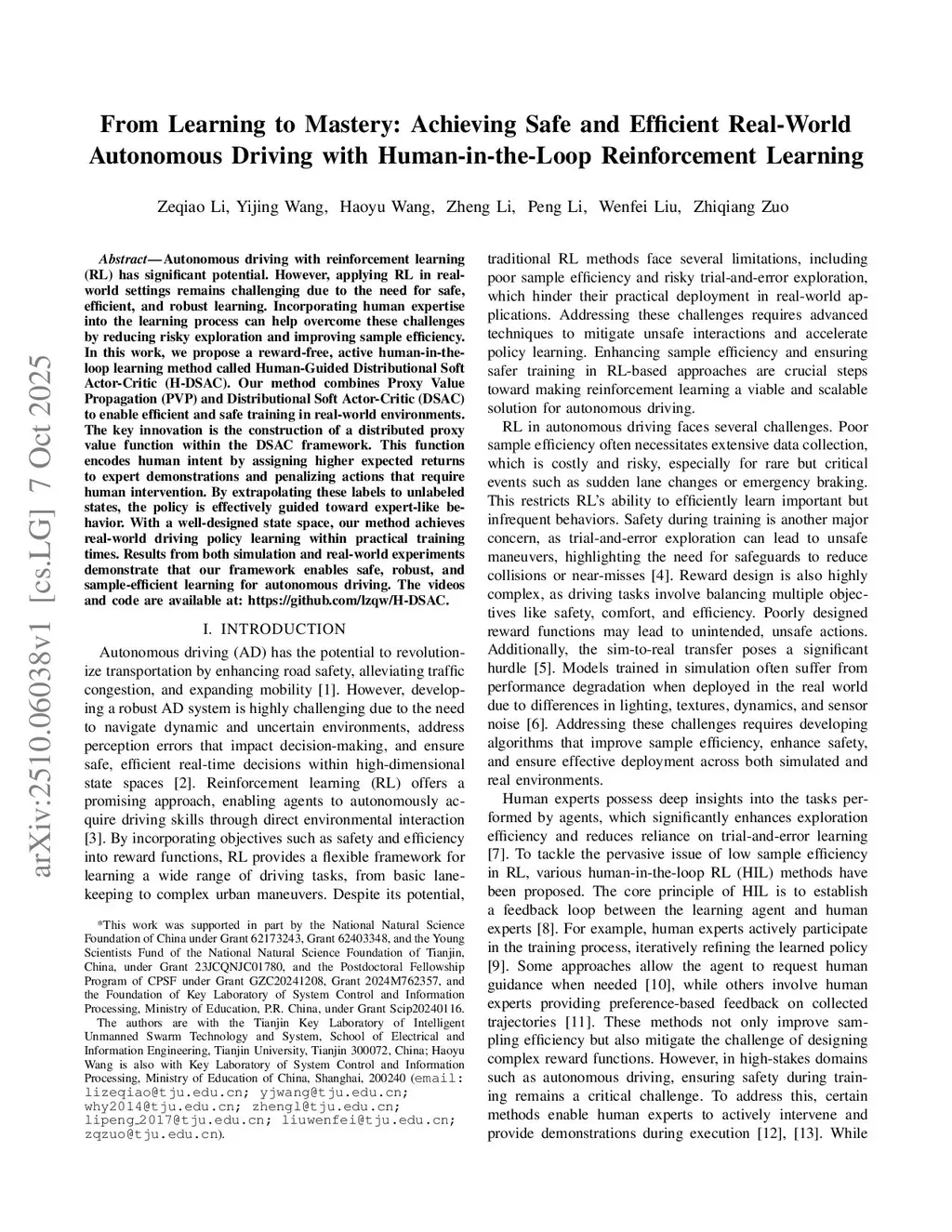 Autonomous driving with reinforcement learning (RL) has significant potential. However, applying RL in real-world settings remains challenging due to the need for safe, efficient, and robust learning. Incorporating human expertise into the learning process can help overcome these challenges by reducing risky exploration and improving sample efficiency. In this work, we propose a reward-free, active human-in-the-loop learning method called Human-Guided Distributional Soft Actor-Critic (H-DSAC). Our method combines Proxy Value Propagation (PVP) and Distributional Soft Actor-Critic (DSAC) to enable efficient and safe training in real-world environments. The key innovation is the construction of a distributed proxy value function within the DSAC framework. This function encodes human intent by assigning higher expected returns to expert demonstrations and penalizing actions that require human intervention. By extrapolating these labels to unlabeled states, the policy is effectively guided toward expert-like behavior. With a well-designed state space, our method achieves real-world driving policy learning within practical training times. Results from both simulation and real-world experiments demonstrate that our framework enables safe, robust, and sample-efficient learning for autonomous driving.