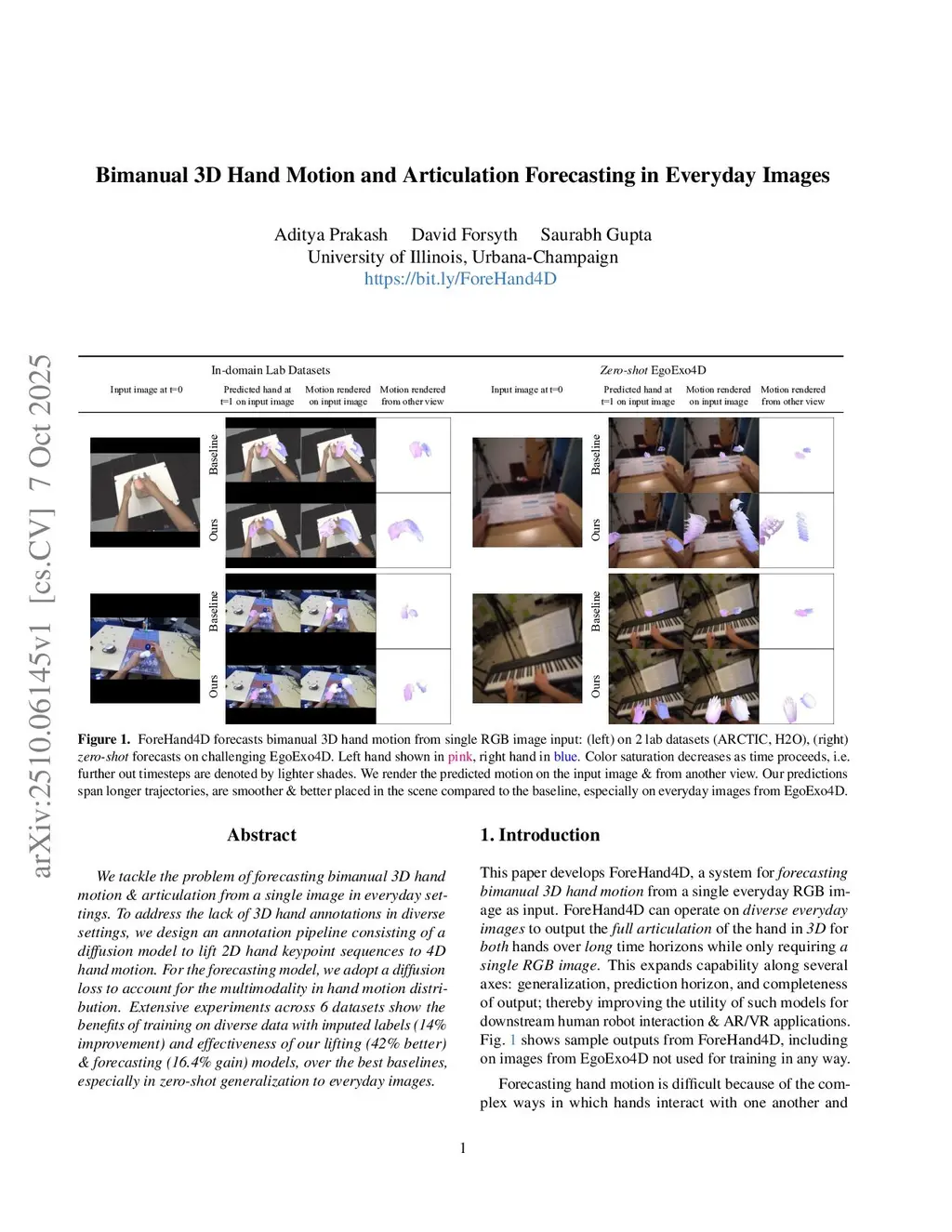 We tackle the problem of forecasting bimanual 3D hand motion & articulation from a single image in everyday settings. To address the lack of 3D hand annotations in diverse settings, we design an annotation pipeline consisting of a diffusion model to lift 2D hand keypoint sequences to 4D hand motion. For the forecasting model, we adopt a diffusion loss to account for the multimodality in hand motion distribution. Extensive experiments across 6 datasets show the benefits of training on diverse data with imputed labels (14% improvement) and effectiveness of our lifting (42% better) & forecasting (16.4% gain) models, over the best baselines, especially in zero-shot generalization to everyday images.