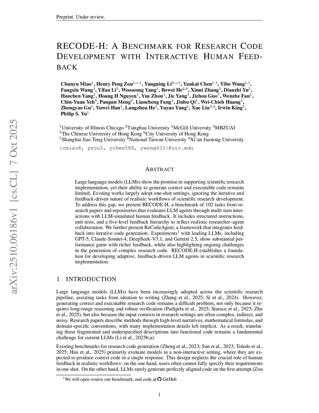 Large language models (LLMs) show the promise in supporting scientific research implementation, yet their ability to generate correct and executable code remains limited. Existing works largely adopt one-shot settings, ignoring the iterative and feedback-driven nature of realistic workflows of scientific research development. To address this gap, we present RECODE-H, a benchmark of 102 tasks from research papers and repositories that evaluates LLM agents through multi-turn interactions with LLM-simulated human feedback. It includes structured instructions,unit tests, and a five-level feedback hierarchy to reflect realistic researcher-agent collaboration. We further present ReCodeAgent, a framework that integrates feedback into iterative code generation. Experiments with leading LLMs, including GPT-5, Claude-Sonnet-4, DeepSeek-V3.1, and Gemini 2.5, show substantial performance gains with richer feedback, while also highlighting ongoing challenges in the generation of complex research code. RECODE-H establishes a foundation for developing adaptive, feedback-driven LLM agents in scientific research implementation