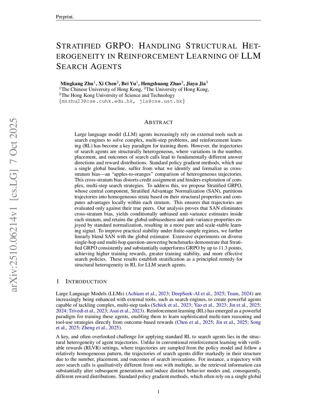 Large language model (LLM) agents increasingly rely on external tools such as search engines to solve complex, multi-step problems, and reinforcement learning (RL) has become a key paradigm for training them. However, the trajectories of search agents are structurally heterogeneous, where variations in the number, placement, and outcomes of search calls lead to fundamentally different answer directions and reward distributions. Standard policy gradient methods, which use a single global baseline, suffer from what we identify and formalize as cross-stratum bias-an "apples-to-oranges" comparison of heterogeneous trajectories. This cross-stratum bias distorts credit assignment and hinders exploration of complex, multi-step search strategies. To address this, we propose Stratified GRPO, whose central component, Stratified Advantage Normalization (SAN), partitions trajectories into homogeneous strata based on their structural properties and computes advantages locally within each stratum. This ensures that trajectories are evaluated only against their true peers. Our analysis proves that SAN eliminates cross-stratum bias, yields conditionally unbiased unit-variance estimates inside each stratum, and retains the global unbiasedness and unit-variance properties enjoyed by standard normalization, resulting in a more pure and scale-stable learning signal. To improve practical stability under finite-sample regimes, we further linearly blend SAN with the global estimator. Extensive experiments on diverse single-hop and multi-hop question-answering benchmarks demonstrate that Stratified GRPO consistently and substantially outperforms GRPO by up to 11.3 points, achieving higher training rewards, greater training stability, and more effective search policies. These results establish stratification as a principled remedy for structural heterogeneity in RL for LLM search agents.