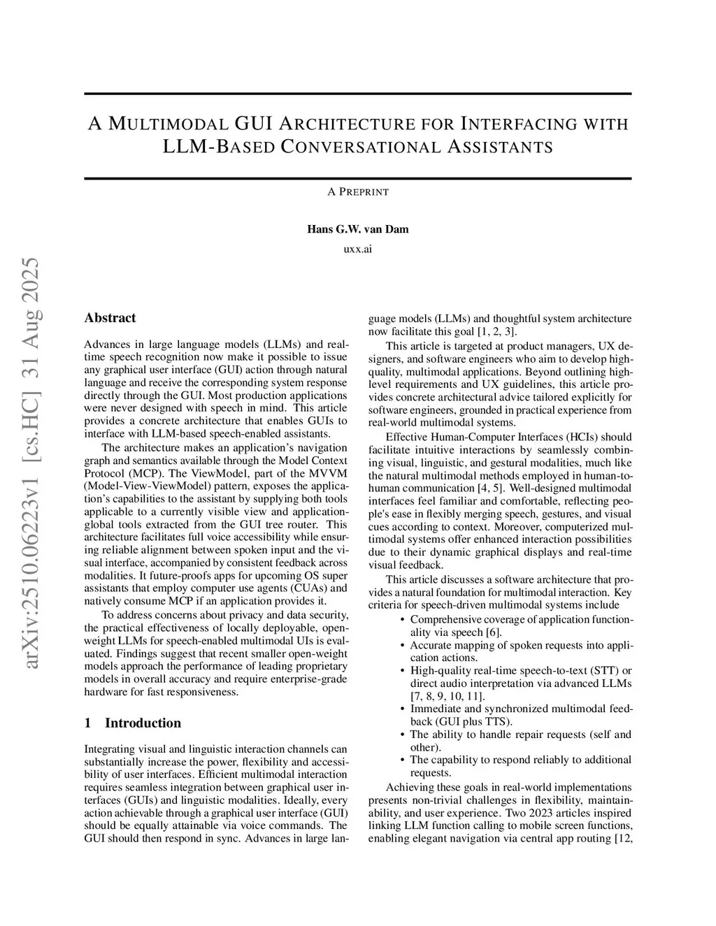 Advances in large language models (LLMs) and real-time speech recognition now make it possible to issue any graphical user interface (GUI) action through natural language and receive the corresponding system response directly through the GUI. Most production applications were never designed with speech in mind. This article provides a concrete architecture that enables GUIs to interface with LLM-based speech-enabled assistants.