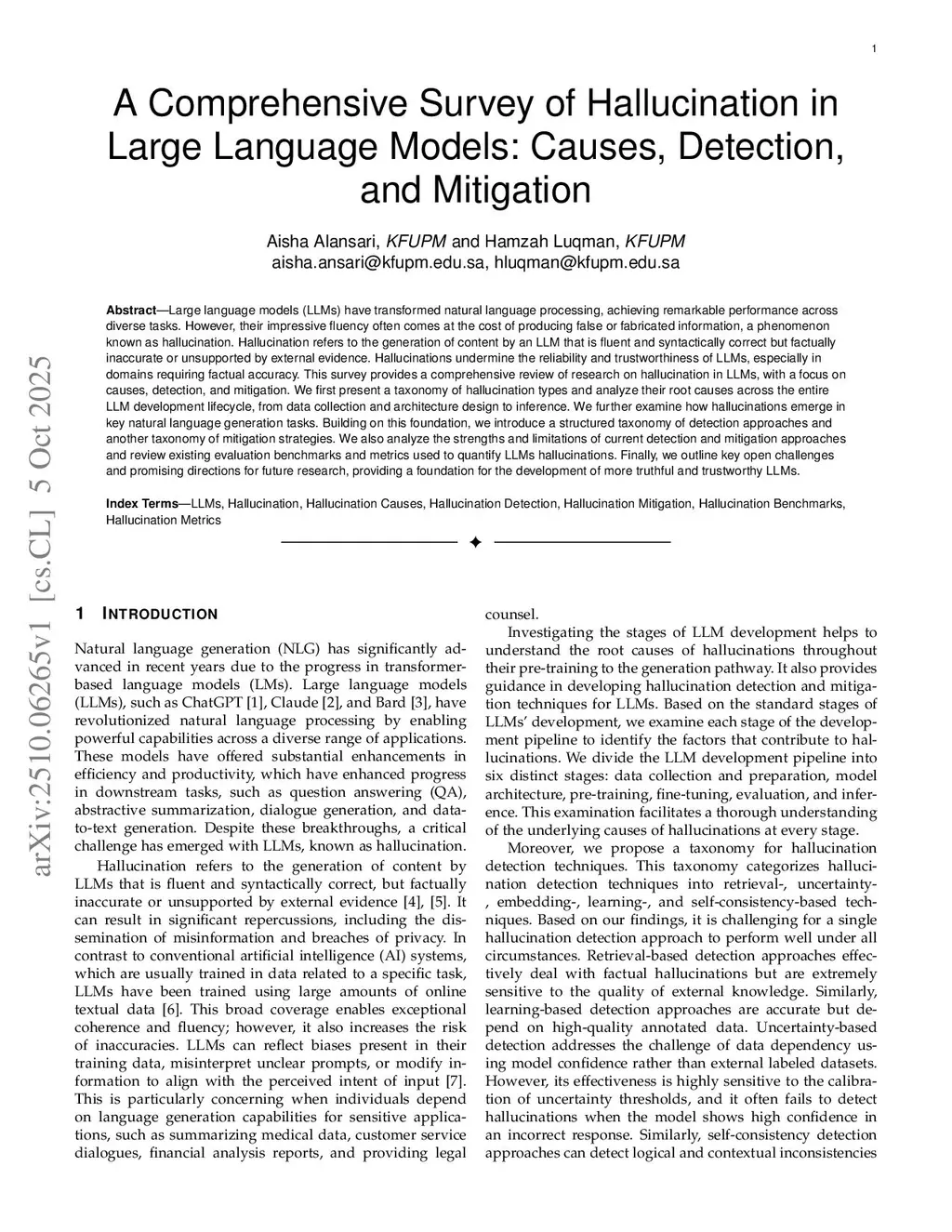 Large language models (LLMs) have transformed natural language processing, achieving remarkable performance across diverse tasks. However, their impressive fluency often comes at the cost of producing false or fabricated information, a phenomenon known as hallucination. Hallucination refers to the generation of content by an LLM that is fluent and syntactically correct but factually inaccurate or unsupported by external evidence. Hallucinations undermine the reliability and trustworthiness of LLMs, especially in domains requiring factual accuracy. This survey provides a comprehensive review of research on hallucination in LLMs, with a focus on causes, detection, and mitigation. We first present a taxonomy of hallucination types and analyze their root causes across the entire LLM development lifecycle, from data collection and architecture design to inference. We further examine how hallucinations emerge in key natural language generation tasks. Building on this foundation, we introduce a structured taxonomy of detection approaches and another taxonomy of mitigation strategies. We also analyze the strengths and limitations of current detection and mitigation approaches and review existing evaluation benchmarks and metrics used to quantify LLMs hallucinations. Finally, we outline key open challenges and promising directions for future research, providing a foundation for the development of more truthful and trustworthy LLMs.