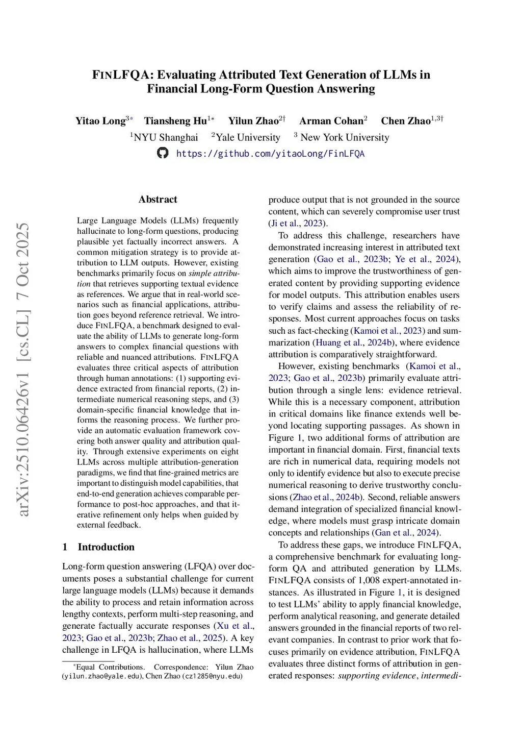 Large Language Models (LLMs) frequently hallucinate to long-form questions, producing plausible yet factually incorrect answers. A common mitigation strategy is to provide attribution to LLM outputs. However, existing benchmarks primarily focus on simple attribution that retrieves supporting textual evidence as references. We argue that in real-world scenarios such as financial applications, attribution goes beyond reference retrieval. We introduce FinLFQA, a benchmark designed to evaluate the ability of LLMs to generate long-form answers to complex financial questions with reliable and nuanced attributions. FinLFQA evaluates three critical aspects of attribution through human annotations: (1) supporting evidence extracted from financial reports, (2) intermediate numerical reasoning steps, and (3) domain-specific financial knowledge that informs the reasoning process. We further provide an automatic evaluation framework covering both answer quality and attribution quality. Through extensive experiments on eight LLMs across multiple attribution-generation paradigms, we find that fine-grained metrics are important to distinguish model capabilities, that end-to-end generation achieves comparable performance to post-hoc approaches, and that iterative refinement only helps when guided by external feedback.