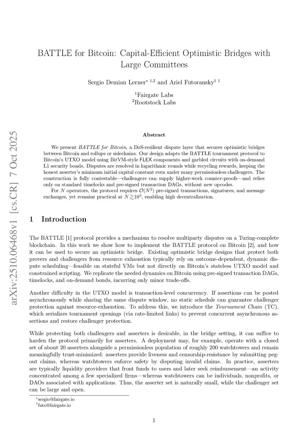 We present BATTLE for Bitcoin, a DoS-resilient dispute layer that secures optimistic bridges between Bitcoin and rollups or sidechains. Our design adapts the BATTLE tournament protocol to Bitcoin's UTXO model using BitVM-style FLEX components and garbled circuits with on-demand L1 security bonds. Disputes are resolved in logarithmic rounds while recycling rewards, keeping the honest asserter's minimum initial capital constant even under many permissionless challengers. The construction is fully contestable (challengers can supply higher-work counter-proofs) and relies only on standard timelocks and pre-signed transaction DAGs, without new opcodes.For operators, the protocol requires pre-signed transactions, signatures, and message exchanges, yet remains practical at , enabling high decentralization.