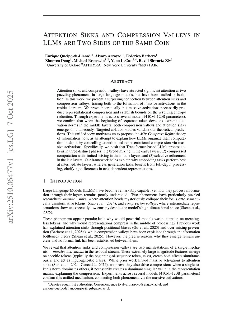 Attention sinks and compression valleys have attracted significant attention as two puzzling phenomena in large language models, but have been studied in isolation. In this work, we present a surprising connection between attention sinks and compression valleys, tracing both to the formation of massive activations in the residual stream. We prove theoretically that massive activations necessarily produce representational compression and establish bounds on the resulting entropy reduction. Through experiments across several models (410M-120B parameters), we confirm that when the beginning-of-sequence token develops extreme activation norms in the middle layers, both compression valleys and attention sinks emerge simultaneously. Targeted ablation studies validate our theoretical predictions. This unified view motivates us to propose the Mix-Compress-Refine theory of information flow, as an attempt to explain how LLMs organize their computation in depth by controlling attention and representational compression via massive activations. Specifically, we posit that Transformer-based LLMs process tokens in three distinct phases: (1) broad mixing in the early layers, (2) compressed computation with limited mixing in the middle layers, and (3) selective refinement in the late layers. Our framework helps explain why embedding tasks perform best at intermediate layers, whereas generation tasks benefit from full-depth processing, clarifying differences in task-dependent representations.