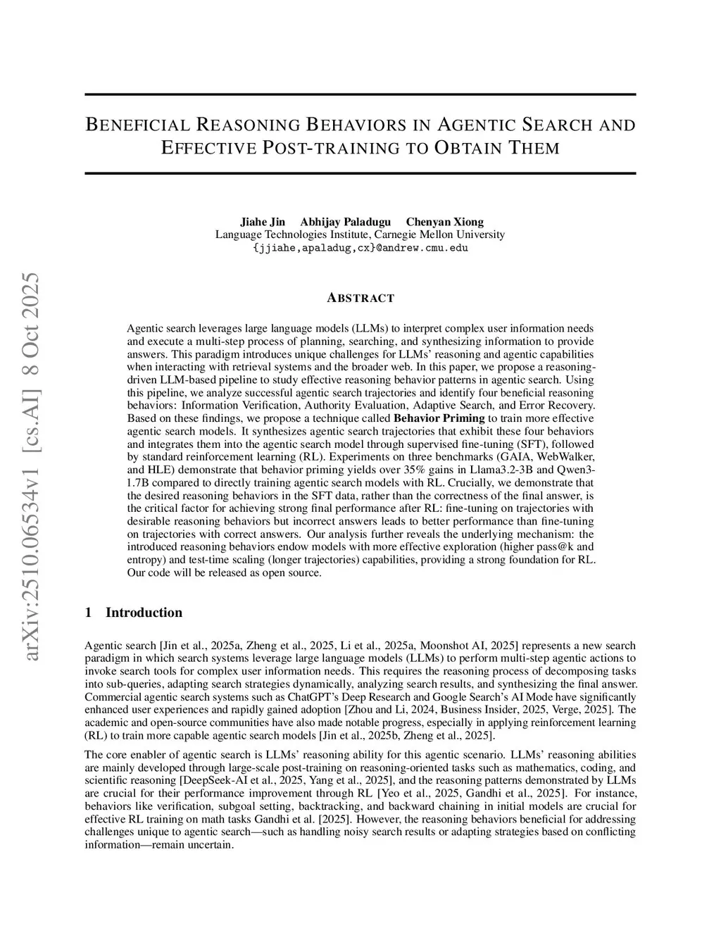 Beneficial Reasoning Behaviors in Agentic Search and Effective Post-training to Obtain Them