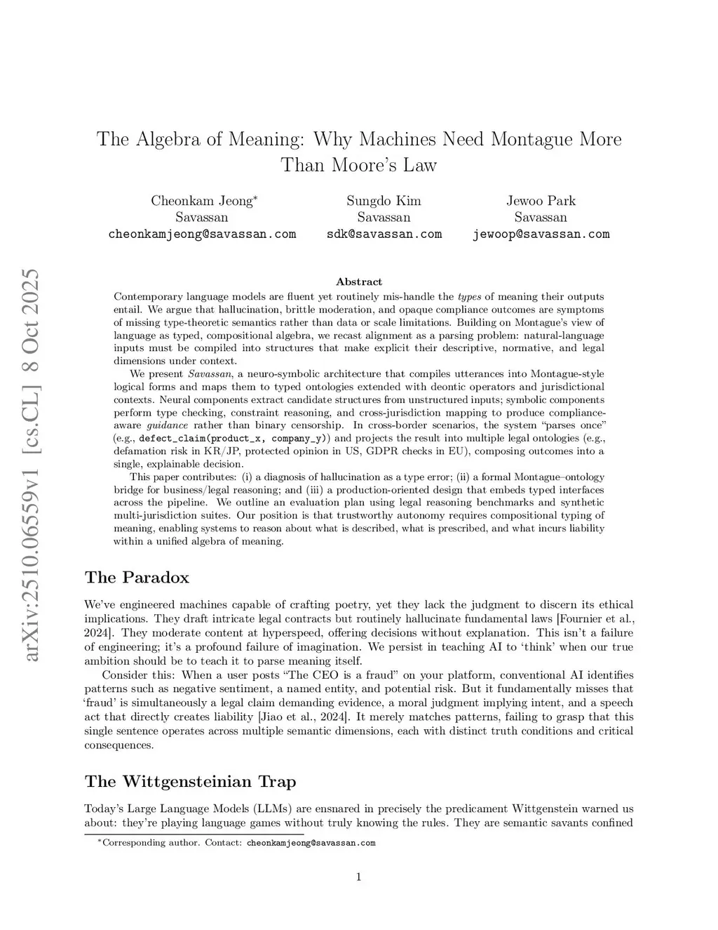 Contemporary language models are fluent yet routinely mis-handle the types of meaning their outputs entail. We argue that hallucination, brittle moderation, and opaque compliance outcomes are symptoms of missing type-theoretic semantics rather than data or scale limitations. Building on Montague's view of language as typed, compositional algebra, we recast alignment as a parsing problem: natural-language inputs must be compiled into structures that make explicit their descriptive, normative, and legal dimensions under context.We present Savassan, a neuro-symbolic architecture that compiles utterances into Montague-style logical forms and maps them to typed ontologies extended with deontic operators and jurisdictional contexts. Neural components extract candidate structures from unstructured inputs; symbolic components perform type checking, constraint reasoning, and cross-jurisdiction mapping to produce compliance-aware guidance rather than binary censorship. In cross-border scenarios, the system "parses once" (e.g., defect claim(product x, company y)) and projects the result into multiple legal ontologies (e.g., defamation risk in KR/JP, protected opinion in US, GDPR checks in EU), composing outcomes into a single, explainable decision.This paper contributes: (i) a diagnosis of hallucination as a type error; (ii) a formal Montague-ontology bridge for business/legal reasoning; and (iii) a production-oriented design that embeds typed interfaces across the pipeline. We outline an evaluation plan using legal reasoning benchmarks and synthetic multi-jurisdiction suites. Our position is that trustworthy autonomy requires compositional typing of meaning, enabling systems to reason about what is described, what is prescribed, and what incurs liability within a unified algebra of meaning.
