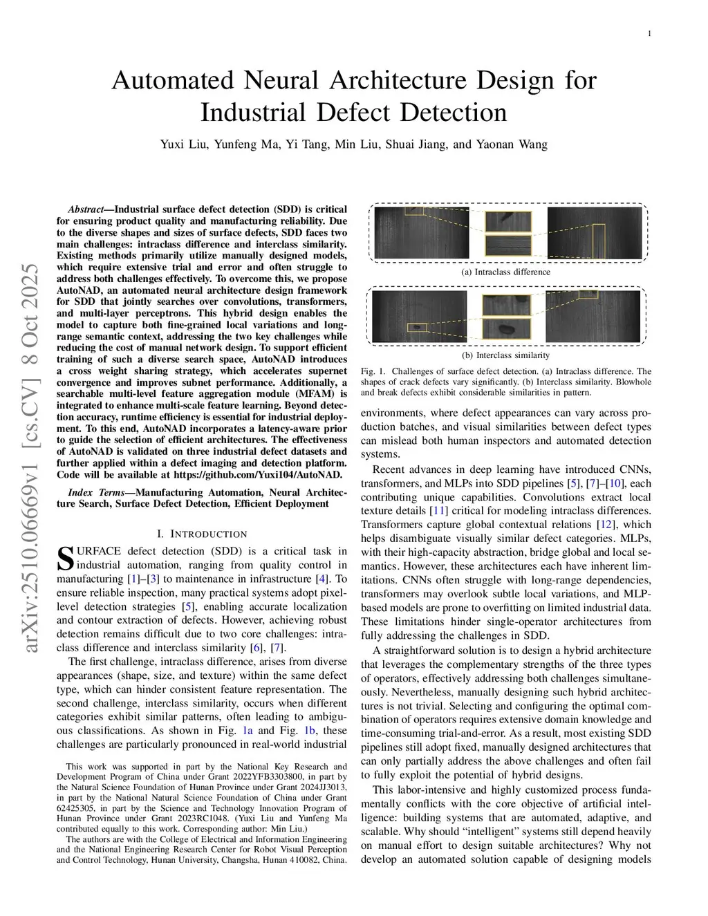 Industrial surface defect detection (SDD) is critical for ensuring product quality and manufacturing reliability. Due to the diverse shapes and sizes of surface defects, SDD faces two main challenges: intraclass difference and interclass similarity. Existing methods primarily utilize manually designed models, which require extensive trial and error and often struggle to address both challenges effectively. To overcome this, we propose AutoNAD, an automated neural architecture design framework for SDD that jointly searches over convolutions, transformers, and multi-layer perceptrons. This hybrid design enables the model to capture both fine-grained local variations and long-range semantic context, addressing the two key challenges while reducing the cost of manual network design. To support efficient training of such a diverse search space, AutoNAD introduces a cross weight sharing strategy, which accelerates supernet convergence and improves subnet performance. Additionally, a searchable multi-level feature aggregation module (MFAM) is integrated to enhance multi-scale feature learning. Beyond detection accuracy, runtime efficiency is essential for industrial deployment. To this end, AutoNAD incorporates a latency-aware prior to guide the selection of efficient architectures. The effectiveness of AutoNAD is validated on three industrial defect datasets and further applied within a defect imaging and detection platform. Code is available atthis https URL.