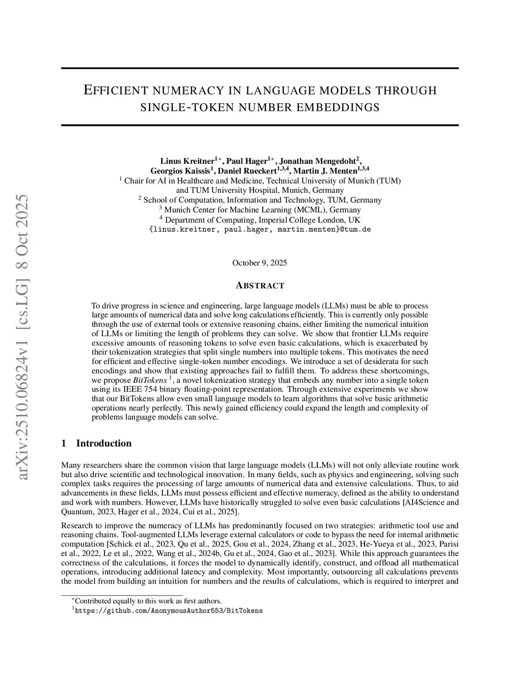 To drive progress in science and engineering, large language models (LLMs) must be able to process large amounts of numerical data and solve long calculations efficiently. This is currently only possible through the use of external tools or extensive reasoning chains, either limiting the numerical intuition of LLMs or limiting the length of problems they can solve. We show that frontier LLMs require excessive amounts of reasoning tokens to solve even basic calculations, which is exacerbated by their tokenization strategies that split single numbers into multiple tokens. This motivates the need for efficient and effective single-token number encodings. We introduce a set of desiderata for such encodings and show that existing approaches fail to fulfill them. To address these shortcomings, we propose BitTokens, a novel tokenization strategy that embeds any number into a single token using its IEEE 754 binary floating-point representation. Through extensive experiments we show that our BitTokens allow even small language models to learn algorithms that solve basic arithmetic operations nearly perfectly. This newly gained efficiency could expand the length and complexity of problems language models can solve.