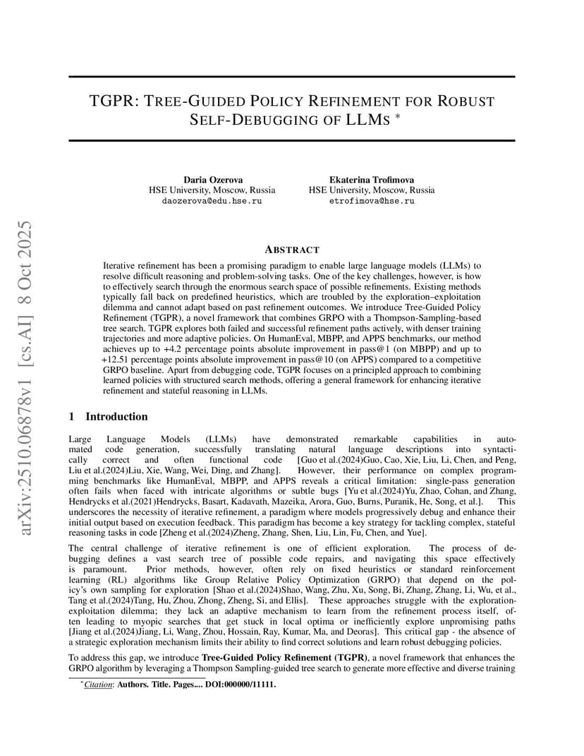 Iterative refinement has been a promising paradigm to enable large language models (LLMs) to resolve difficult reasoning and problem-solving tasks. One of the key challenges, however, is how to effectively search through the enormous search space of possible refinements. Existing methods typically fall back on predefined heuristics, which are troubled by the exploration-exploitation dilemma and cannot adapt based on past refinement outcomes. We introduce Tree-Guided Policy Refinement (TGPR), a novel framework that combines GRPO with a Thompson-Sampling-based tree search. TGPR explores both failed and successful refinement paths actively, with denser training trajectories and more adaptive policies. On HumanEval, MBPP, and APPS benchmarks, our method achieves up to +4.2 percentage points absolute improvement in pass@1 (on MBPP) and up to +12.51 percentage points absolute improvement in pass@10 (on APPS) compared to a competitive GRPO baseline. Apart from debugging code, TGPR focuses on a principled approach to combining learned policies with structured search methods, offering a general framework for enhancing iterative refinement and stateful reasoning in LLMs.