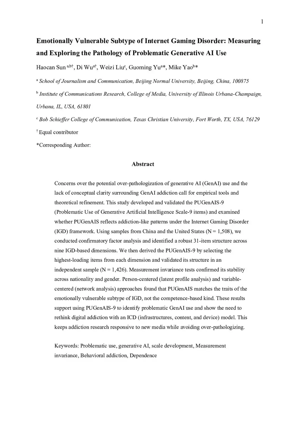 Emotionally Vulnerable Subtype of Internet Gaming Disorder: Measuring and Exploring the Pathology of Problematic Generative AI Use