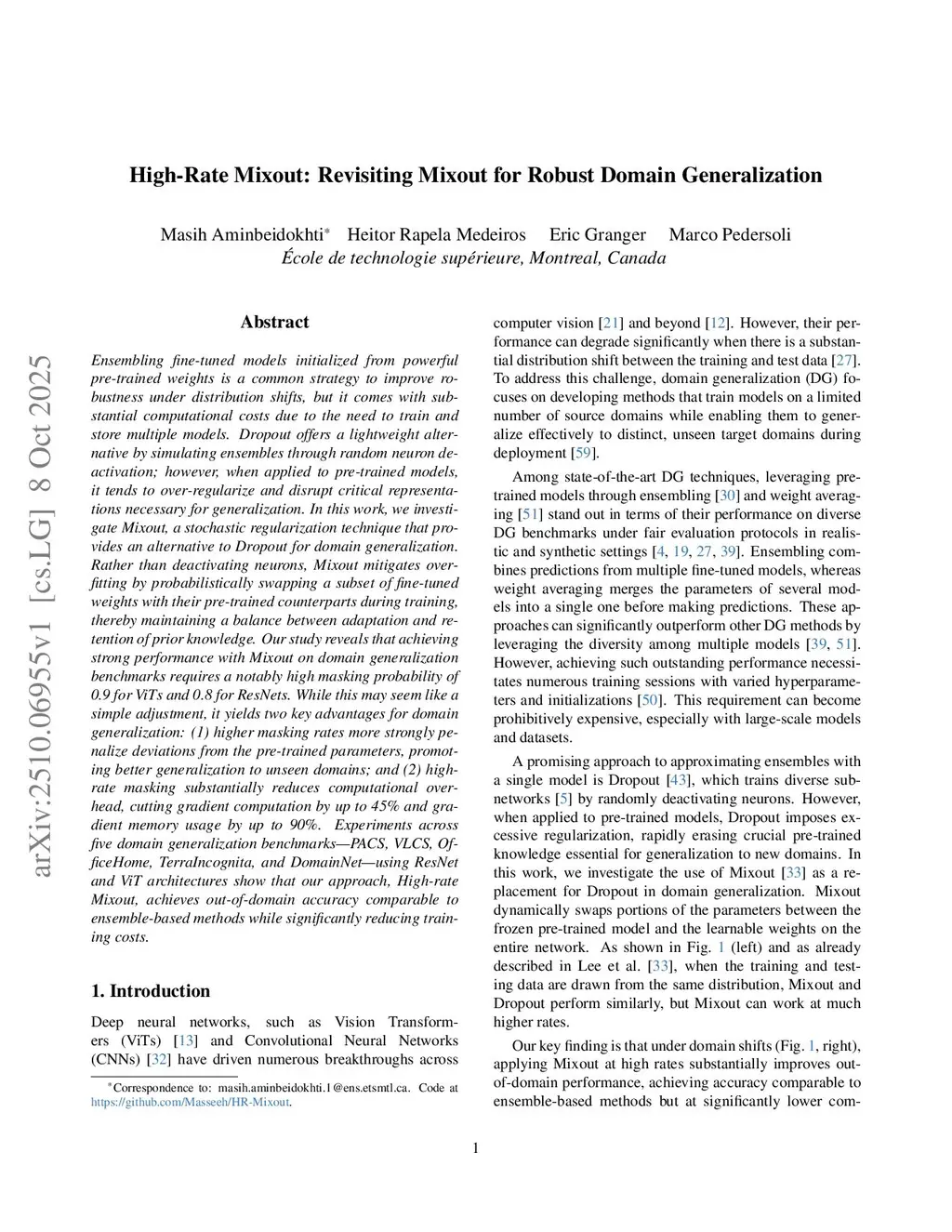Ensembling fine-tuned models initialized from powerful pre-trained weights is a common strategy to improve robustness under distribution shifts, but it comes with substantial computational costs due to the need to train and store multiple models. Dropout offers a lightweight alternative by simulating ensembles through random neuron deactivation; however, when applied to pre-trained models, it tends to over-regularize and disrupt critical representations necessary for generalization. In this work, we investigate Mixout, a stochastic regularization technique that provides an alternative to Dropout for domain generalization. Rather than deactivating neurons, Mixout mitigates overfitting by probabilistically swapping a subset of fine-tuned weights with their pre-trained counterparts during training, thereby maintaining a balance between adaptation and retention of prior knowledge. Our study reveals that achieving strong performance with Mixout on domain generalization benchmarks requires a notably high masking probability of 0.9 for ViTs and 0.8 for ResNets. While this may seem like a simple adjustment, it yields two key advantages for domain generalization: (1) higher masking rates more strongly penalize deviations from the pre-trained parameters, promoting better generalization to unseen domains; and (2) high-rate masking substantially reduces computational overhead, cutting gradient computation by up to 45% and gradient memory usage by up to 90%. Experiments across five domain generalization benchmarks, PACS, VLCS, OfficeHome, TerraIncognita, and DomainNet, using ResNet and ViT architectures, show that our approach, High-rate Mixout, achieves out-of-domain accuracy comparable to ensemble-based methods while significantly reducing training costs.