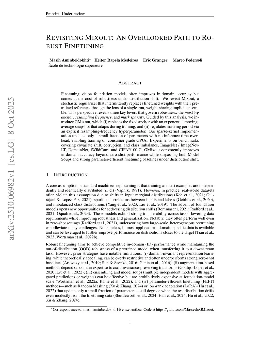 Finetuning vision foundation models often improves in-domain accuracy but comes at the cost of robustness under distribution shift. We revisit Mixout, a stochastic regularizer that intermittently replaces finetuned weights with their pretrained reference, through the lens of a single-run, weight-sharing implicit ensemble. This perspective reveals three key levers that govern robustness: the \emph{masking anchor}, \emph{resampling frequency}, and \emph{mask sparsity}. Guided by this analysis, we introduce GMixout, which (i) replaces the fixed anchor with an exponential moving-average snapshot that adapts during training, and (ii) regulates masking period via an explicit resampling-frequency hyperparameter. Our sparse-kernel implementation updates only a small fraction of parameters with no inference-time overhead, enabling training on consumer-grade GPUs. Experiments on benchmarks covering covariate shift, corruption, and class imbalance, ImageNet / ImageNet-LT, DomainNet, iWildCam, and CIFAR100-C, GMixout consistently improves in-domain accuracy beyond zero-shot performance while surpassing both Model Soups and strong parameter-efficient finetuning baselines under distribution shift.