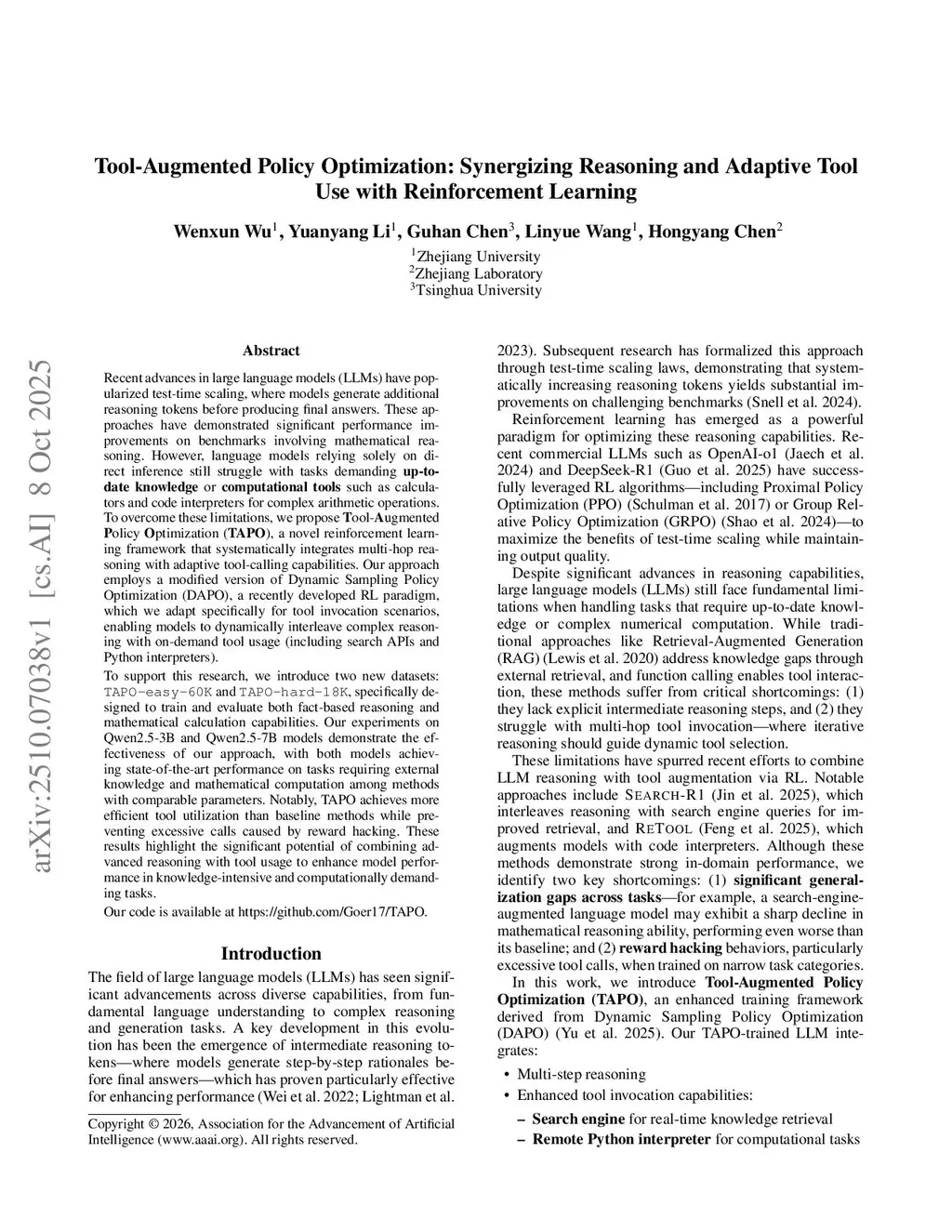 Recent advances in large language models (LLMs) have popularized test-time scaling, where models generate additional reasoning tokens before producing final answers. These approaches have demonstrated significant performance improvements on benchmarks involving mathematical reasoning. However, language models relying solely on direct inference still struggle with tasks demanding up-to-date knowledge or computational tools such as calculators and code interpreters for complex arithmetic operations. To overcome these limitations, we propose Tool-Augmented Policy Optimization (TAPO), a novel reinforcement learning framework that systematically integrates multi-hop reasoning with adaptive tool-calling capabilities. Our approach employs a modified version of Dynamic Sampling Policy Optimization (DAPO), a recently developed RL paradigm, which we adapt specifically for tool invocation scenarios, enabling models to dynamically interleave complex reasoning with on-demand tool usage (including search APIs and Python interpreters).To support this research, we introduce two new datasets: TAPO-easy-60K and TAPO-hard-18K, specifically designed to train and evaluate both fact-based reasoning and mathematical calculation capabilities. Our experiments on Qwen2.5-3B and Qwen2.5-7B models demonstrate the effectiveness of our approach, with both models achieving state-of-the-art performance on tasks requiring external knowledge and mathematical computation among methods with comparable parameters. Notably, TAPO achieves more efficient tool utilization than baseline methods while preventing excessive calls caused by reward hacking. These results highlight the significant potential of combining advanced reasoning with tool usage to enhance model performance in knowledge-intensive and computationally demanding tasks.