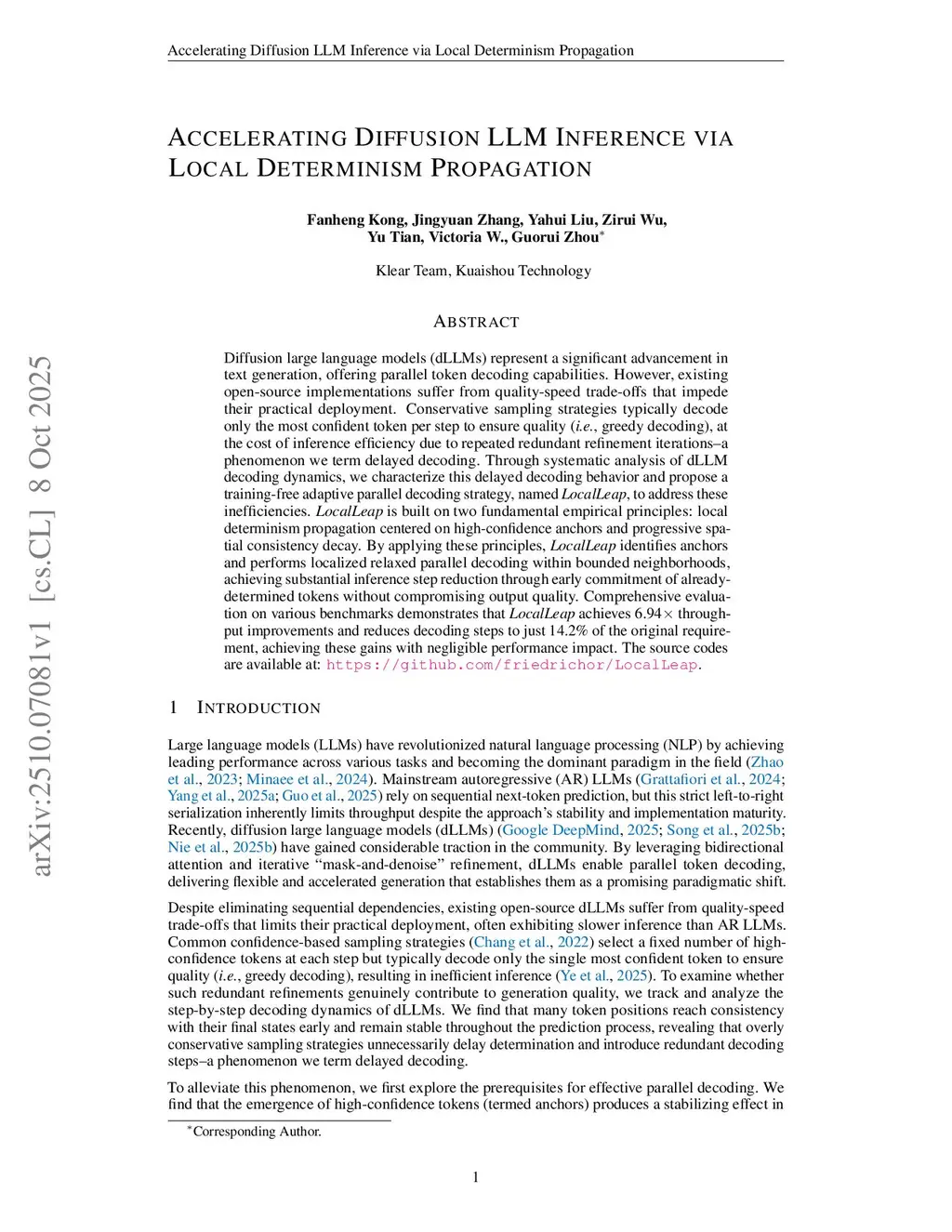 Diffusion large language models (dLLMs) represent a significant advancement in text generation, offering parallel token decoding capabilities. However, existing open-source implementations suffer from quality-speed trade-offs that impede their practical deployment. Conservative sampling strategies typically decode only the most confident token per step to ensure quality (i.e., greedy decoding), at the cost of inference efficiency due to repeated redundant refinement iterations--a phenomenon we term delayed decoding. Through systematic analysis of dLLM decoding dynamics, we characterize this delayed decoding behavior and propose a training-free adaptive parallel decoding strategy, named LocalLeap, to address these inefficiencies. LocalLeap is built on two fundamental empirical principles: local determinism propagation centered on high-confidence anchors and progressive spatial consistency decay. By applying these principles, LocalLeap identifies anchors and performs localized relaxed parallel decoding within bounded neighborhoods, achieving substantial inference step reduction through early commitment of already-determined tokens without compromising output quality. Comprehensive evaluation on various benchmarks demonstrates that LocalLeap achieves 6.94 throughput improvements and reduces decoding steps to just 14.2\% of the original requirement, achieving these gains with negligible performance impact. The source codes are available at:this https URL.
