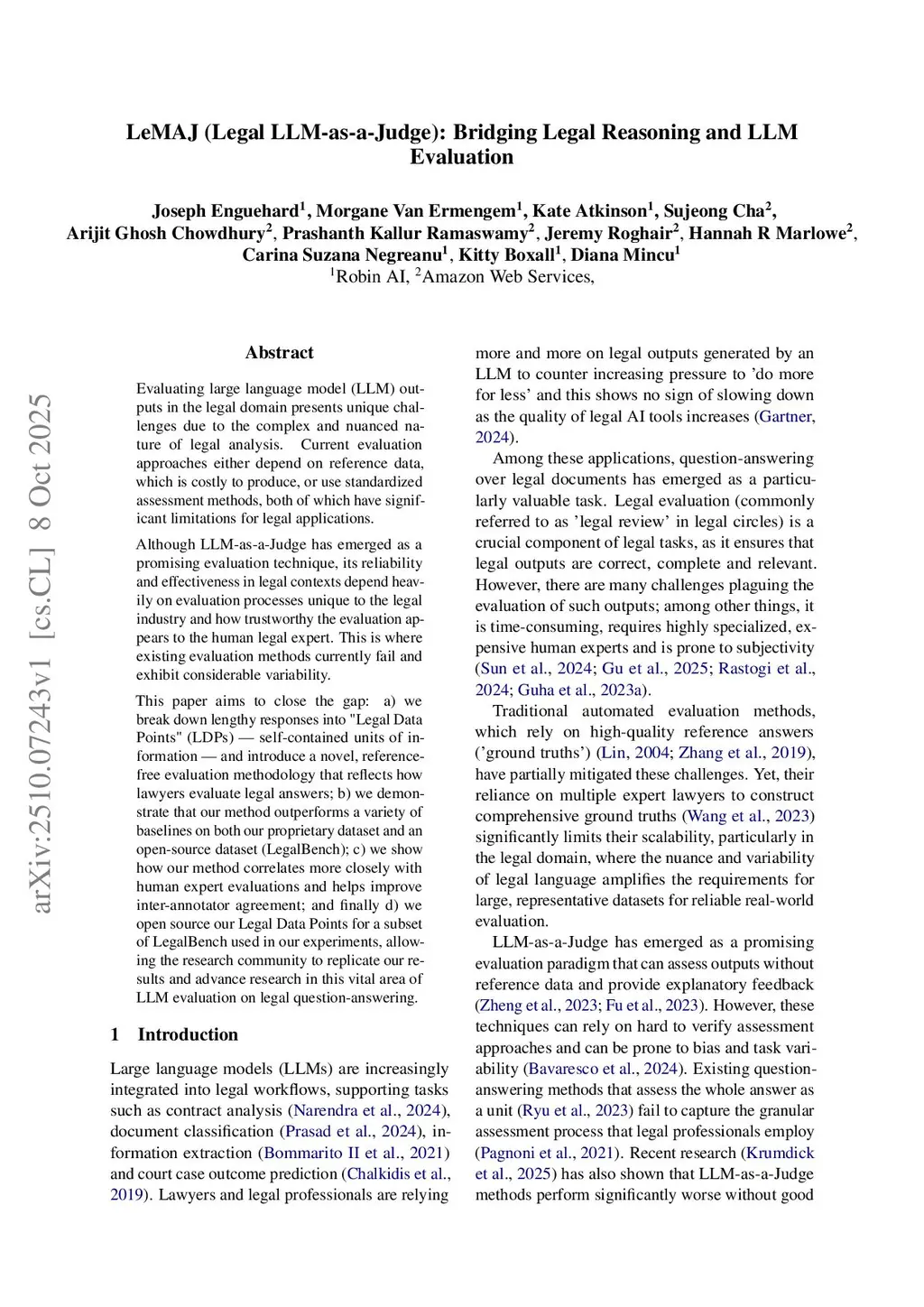 Evaluating large language model (LLM) outputs in the legal domain presents unique challenges due to the complex and nuanced nature of legal analysis. Current evaluation approaches either depend on reference data, which is costly to produce, or use standardized assessment methods, both of which have significant limitations for legal applications.Although LLM-as-a-Judge has emerged as a promising evaluation technique, its reliability and effectiveness in legal contexts depend heavily on evaluation processes unique to the legal industry and how trustworthy the evaluation appears to the human legal expert. This is where existing evaluation methods currently fail and exhibit considerable variability.This paper aims to close the gap: a) we break down lengthy responses into 'Legal Data Points' (LDPs), self-contained units of information, and introduce a novel, reference-free evaluation methodology that reflects how lawyers evaluate legal answers; b) we demonstrate that our method outperforms a variety of baselines on both our proprietary dataset and an open-source dataset (LegalBench); c) we show how our method correlates more closely with human expert evaluations and helps improve inter-annotator agreement; and finally d) we open source our Legal Data Points for a subset of LegalBench used in our experiments, allowing the research community to replicate our results and advance research in this vital area of LLM evaluation on legal question-answering.